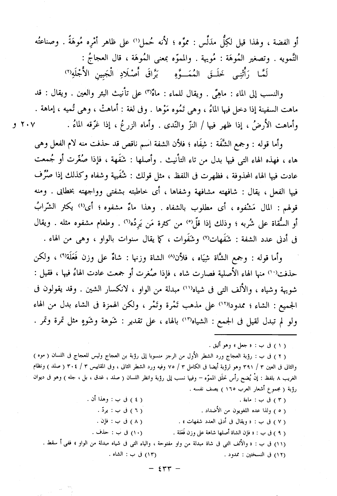 وأما قوله: وجمع الشفة: شفاه؛ فلأن الشفة اسم ناقص قد حذفت منه لام الفعل وهي هاء، فهذه الهاء التي فيها بدل من تاء التأنيث. وأصلها: شفهة، فإذا صغرت أو جمعت عادت فيها الهاء المحذوفة، فظهرت في اللفظ، مثل قولك: شفيهة وشفاه وكذلك إذا صرف فيها الفعل، يقال: شافهته مشافهة وشفاها، أي خاطبته بشفتي وواجهته بخطابي. ومنه قولهم: المال مشفوه، أي مطلوب بالشفاه. وهذا ماء مشفوه؛ أي يكثر الشراب أو السقاة على شربه؛ وذلك إذا قل من كثرة من يرده. وطعام مشفوه مثله. ويقال في أدنى عدد الشفة: شفهات وشفوات، كما يقال سنوات بالواو، وهي من الهاء.