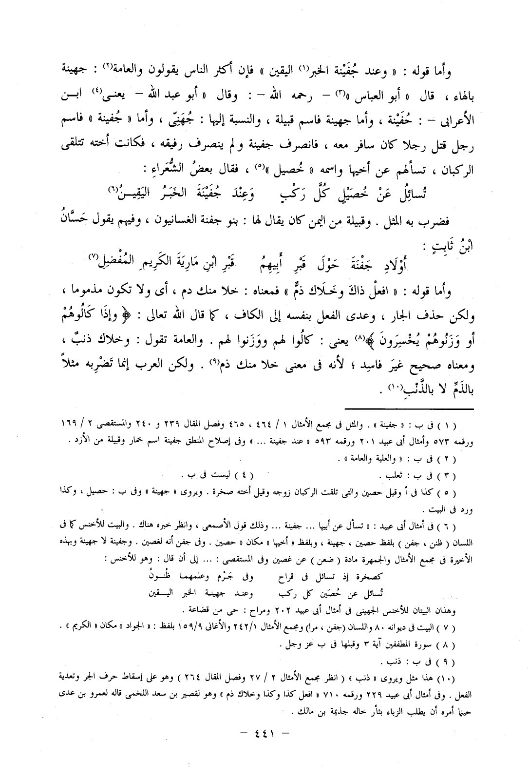 وأما قوله: "وعند حفينة الخبر اليقين" فإن أكثر الناس يقولون والعامة: جهينة بالهاء، قال "أبو العباس"- رحمه الله-: وقال "أبو عبد الله- يعني ابن الأعرابي-: حفينة، وأما جهينة فاسم قبيلة، والنسبة إليها: جهني، وأما "جفينة" فاسم رجل قتل رجلا كان سافر معه، فانصرف جفينة ولم ينصرف رفيه، فكانت أخته تتلقى الركبان، تسألهم عن أخيها واسمه "خصيل"، فقال بعض الشعراء: