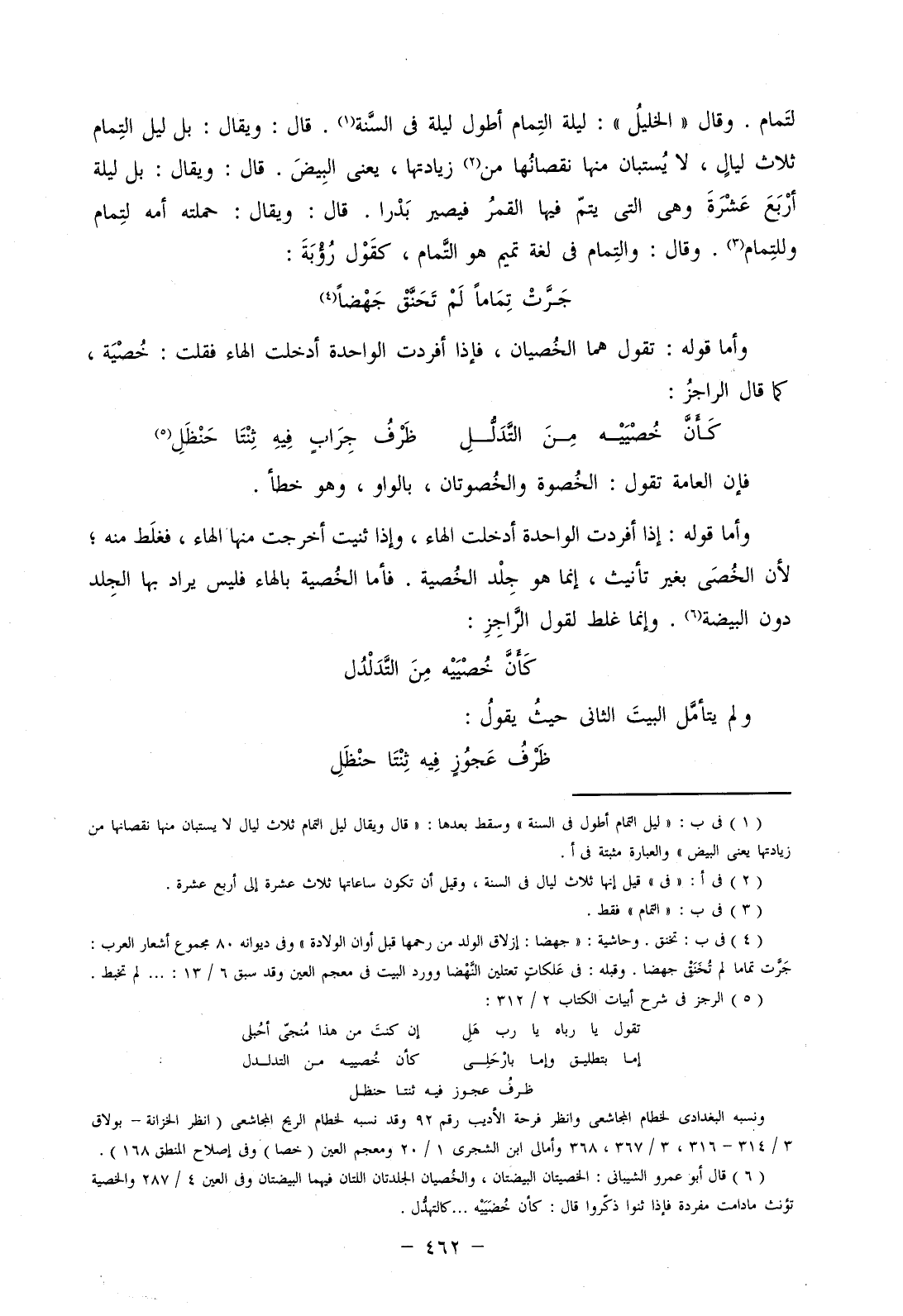 وأما قوله: تقول هما الخصيان، فإذا أفردت الواحدة أدخلت الهاء فقلت: خصية، كما قال الراجز: