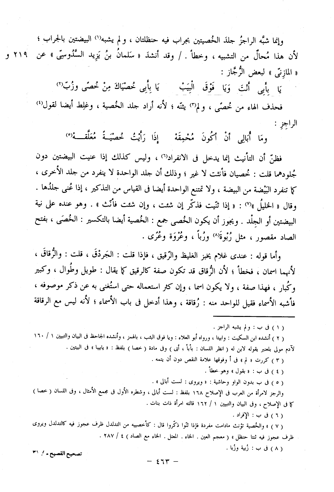 فحذف الهاء من خصي، ولم يثنه؛ لنه أراد جلد الخصية، وغلط أيضا لقول الراجز: