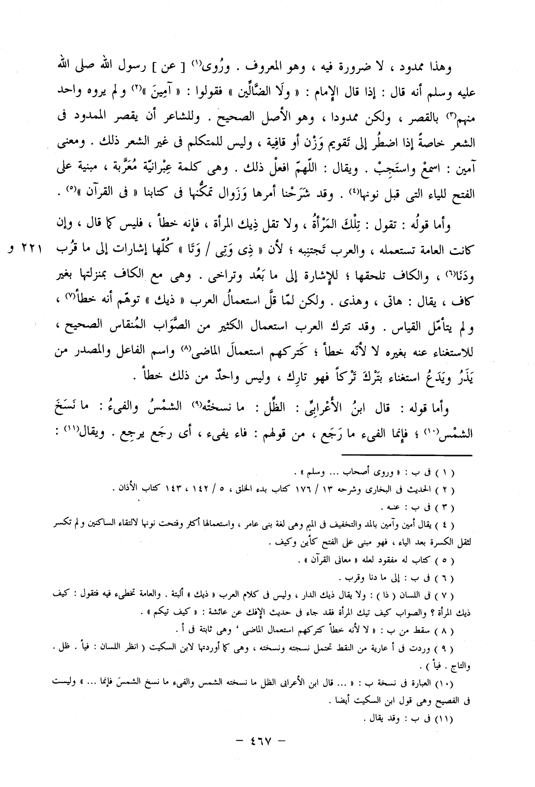 وهذا ممدود، لا ضرورة فيه، وهو المعروف. وروي [عن] رسول الله صلى الله عليه وسلم أنه قال: إذا قال الإمام: "ولا الضالين" فقولوا: "آمين" ولم يروه واحد منهم بالقصر، ولكن ممدودا، وهو الأصل الصحيح. وللشاعر أن يقصر الممدود في الشعر خاصة إذا اضطر إلى تقويم وزن أو قافية، وليس للمتكلم في غير الشعر ذلك. ومعنى آمين: اسمع واستجب. ويقال: اللهم افعل ذلك. وهي كلمة عبرانية معربة، مبنية على الفتح للياء التي قبل نونها. وقد شرحنا أمرها وزوال تمكنها في كتابنا "في القرآن".