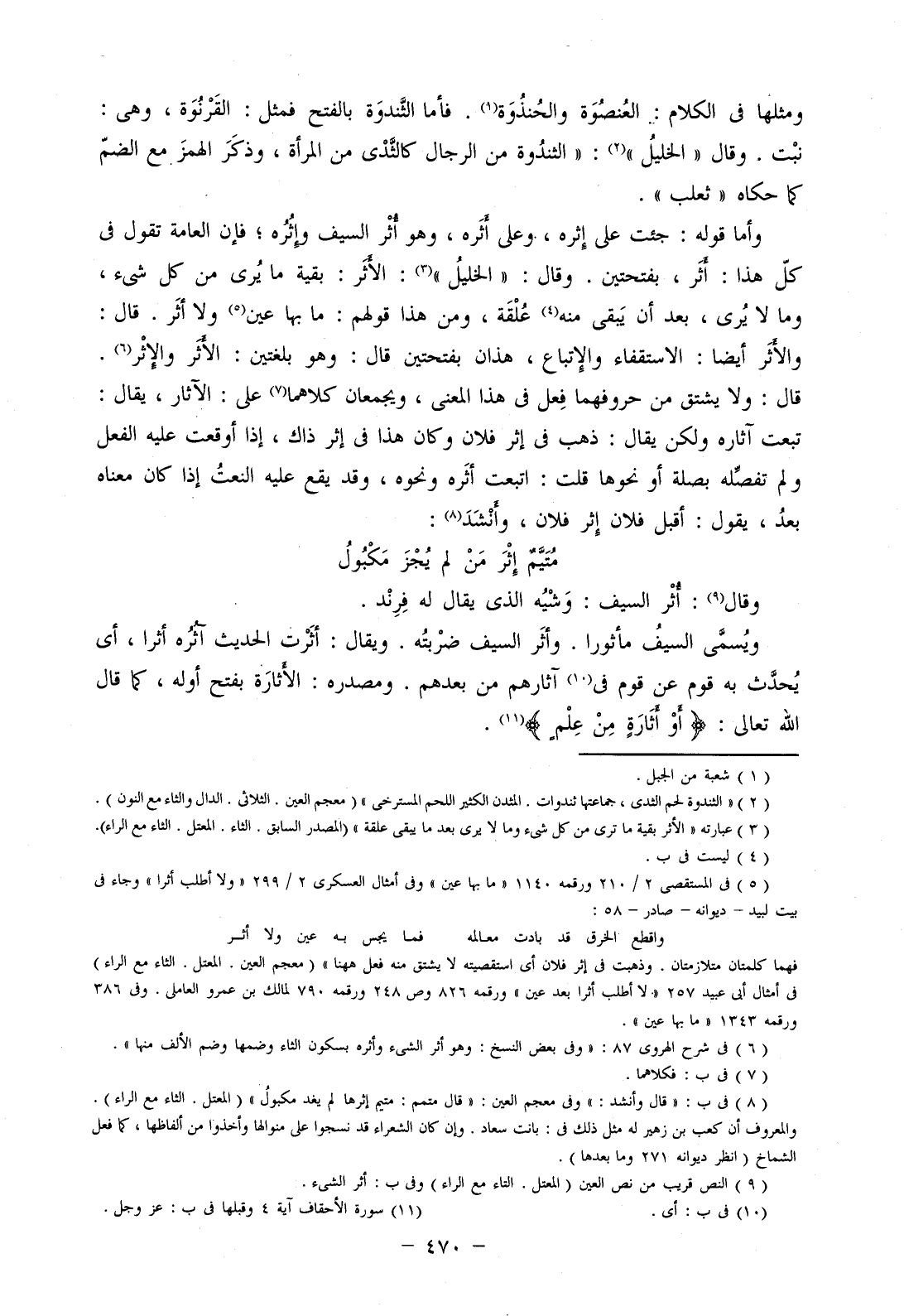 وأما قوله: جئت على إثره، وعلى أثره، وهو أثر السيف وإثره؛ فإن العامة تقول في كل هذا: أثر، بفتحتين. وقال: "الخليل": الأثر: بقية ما يرى من كل شيء، وما لا يرى، بعد أن يبقى منه علقة، ومن هذا قولهم: ما بها عين ولا أثر. قال: والأثر أيضا: الاستقفاء والإتباع، هذان بفتحتين قال: وهو بلغتين: الأثر والإثر. قال: ولا يشتق من حروفهما فعل في هذا المعنى، ويجمعان كلاهما على: الآثار، يقال: تبعت آثاره ولكن يقال: ذهب في إثر فلان وكان هذا في إثر ذاك، إذا أوقعت عليه الفعل ولم تفصله بصلة أو نحوها قلت: اتبعت أثره ونحوه، وقد يقع عليه النعت إذا كان معناه بعد، يقول: أقبل فلان إثر فلان، وأنشد: