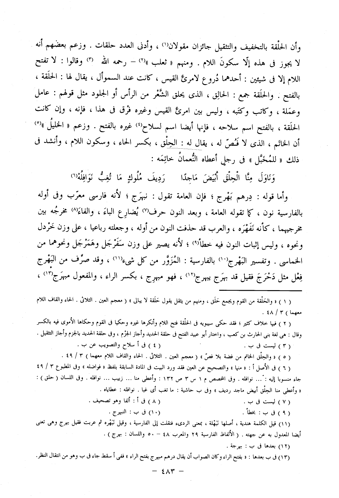 وأما قوله: درهم بهرج؛ فإن العامة تقول: نبهرج؛ لأنه فارسي معرب وفي أوله بالفارسية نون، كما تقوله العامة، وبعد النون حرف يضارع الباء، والفاء مخرجه بين مخرجيهما، كأنه نفهره، والعرب قد حذفت النون من أوله، وجعلته رباعيا، على وزن خردل ونحوه، وليس إثبات النون فيه خطأ؛ لأنه يصير على وزن سفرجل وهمرجل ونحوهما من الخماسي. وتفسير البهرج بالفارسية: المزور من كل شيء، وقد صرف من البهرج فعل مثل دحرج فقيل قد بهرج يبهرج، فهو مبهرج، بكسر الراء، والمفعول مبرهج،
