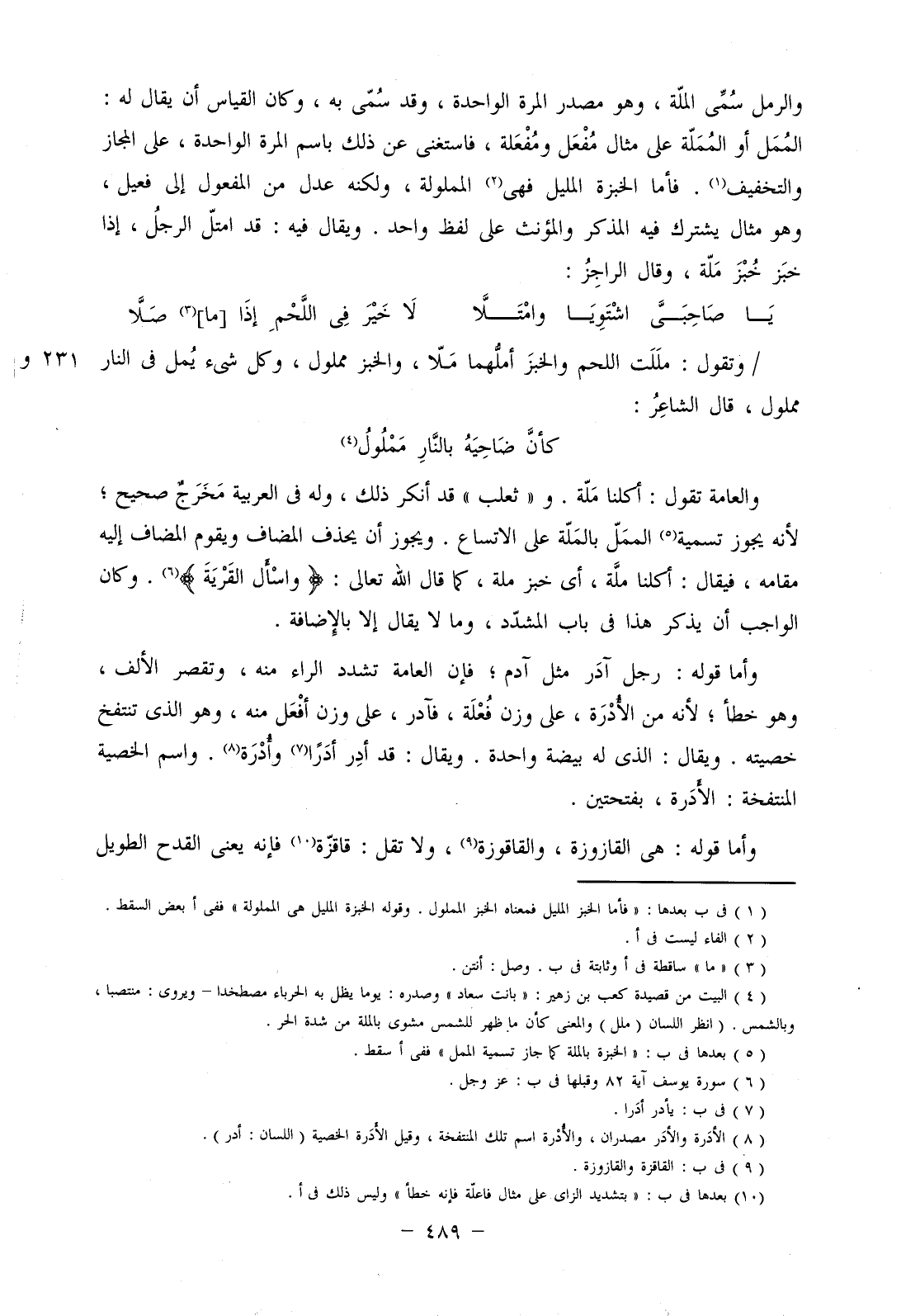 والعامة تقول: أكلنا ملة. و"ثعلب" قد أنكر ذلك، وله في العربية مخرج صحيح؛ لأنه يجوز تسمية الممل بالملة على الاتساع. ويجوز أن يحذف المضاف ويقوم المضاف إليه مقامه، فيقال: أكلنا ملة، أي خبز ملة، كما قال الله تعالى: (واسْأَلِ القَرْيَةَ). وكان الواجب أن يذكر هذا في باب المشدد، وما لا يقال إلا بالإضافة.