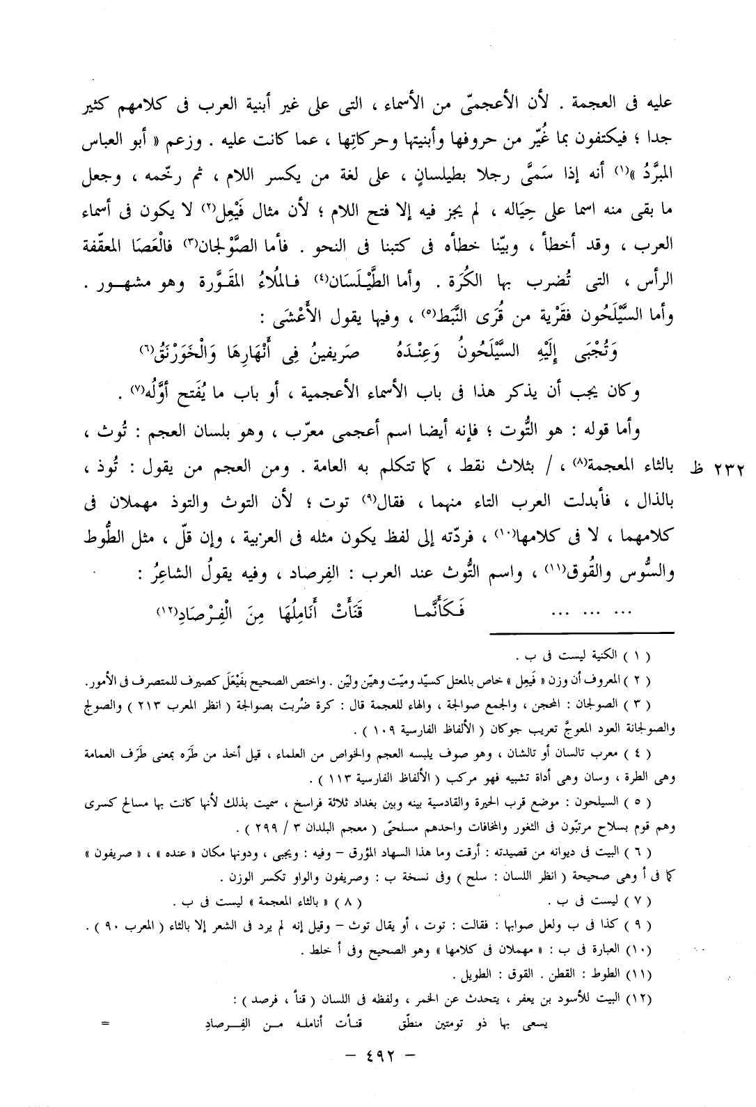 عليه في العجمة. لأن الأعجمي من الأسماء، التي على غير أبنية العرب في كلامهم كثير جدا؛ فيكتفون بما غير من حروفها وأبنيتها وحركاتها، عما كانت عليه. وزعم "أبو العياس المبرد" أنه إذا سمى رجلا بطيلسان، على لغة من يكسر اللام، ثم رخمه، وجعل ما بقي منه اسما على حياله، لم يجز فيه إلا فتح اللام؛ لأن مثال فيعل لا يكون في أسماء العرب، وقد أخطأ، وبينا خطأه في كتبنا في النحو. فأما الصولجان فالعصا المعقفة الرأس، التي تضرب بها الكرة. وأما الطيلسان فالملاء المقورة وهو مشهور. وأما السيلحون فقرية من قرى النبط، وفيها يقول الأعشى: