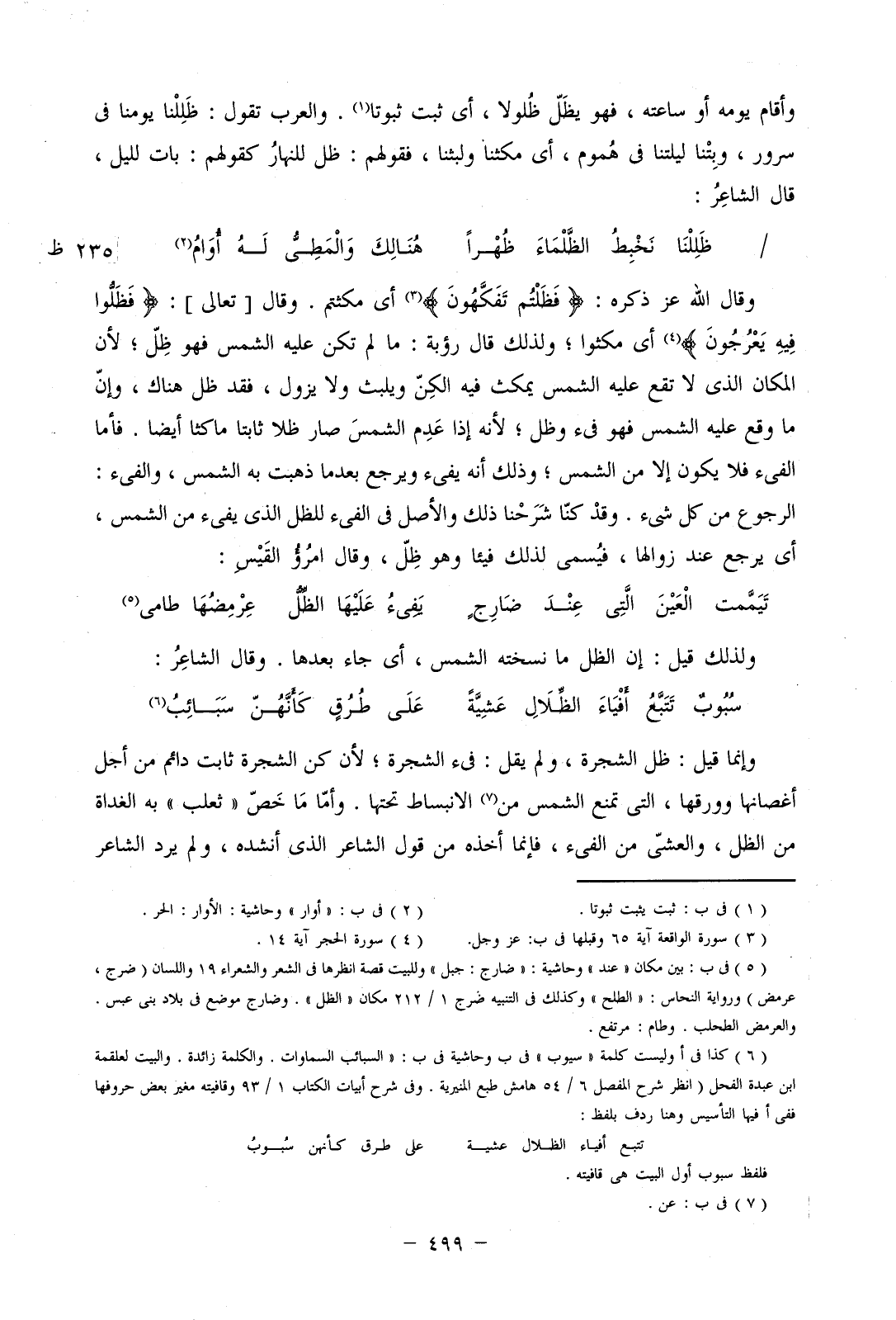 وقال الله عز ذكره: (فَظَلْتُمْ تَفَكَّهُونَ) أي مكثتم. وقال [تعالى]: (فَظَلُّوا فِيهِ يَعْرُجُونَ) أي مكثوا؛ ولذلك قال رؤبة: ما لم تكن عليه الشمس فهو ظل؛ لأن المكان الذي لا تقع عليه الشمس فهو فيء وظل؛ لنه إذا عدم الشمس صار ظلا ثابتا ماكثا أيضا. فأما الفيء فلا يكون إلا من الشمس؛ وذلك أنه يفيء ويرجع بعدما ذهبت به الشمس، والفيء: الرجوع من كل شيء. وقد كنا شرحنا ذلك والأصل في الفيء للظل الذي يفيء من الشمس، أي يرجع عند زوالها، فيسمى لذلك فيئا وهو ظل، وقال امرؤ القيس:
