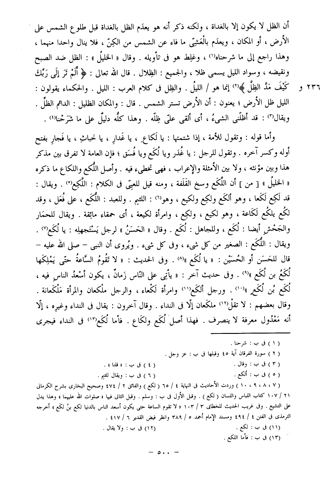 أن الظل لا يكون إلا بالغداة، ولكنه ذكر أنه هو يعدم الظل بالغداة قبل طلوع الشمس على الأرض، أو المكان، ويعدم بالعشي ما فاء عن الشمس من الكن، فلا ينال واحداً منهما، وهذا راجع إلى ما شرحناه، وغلط هو في تأويله. وقال "الخليل": الظل ضد الصبح ونقضيه، وواد الليل يسمي ظلاً، والجميع: الظلال. قال الله تعالى: (أَلَمْ تَرَ إلَى رَبِّكَ كَيْفَ مَدَّ الظِّلَّ) إنما هو/ الليل. والظل في كلام العرب: الليل. والحكماء يقولون: الليل ظل الأرض؛ يعنون: أن الأرض تستر الشمس. قال: والمكان الظليل: الدائم الظل. ويقال: قد أظلني الشيء، أي ألقى على ظله. وهذا كله دليل على ما شرحنا.