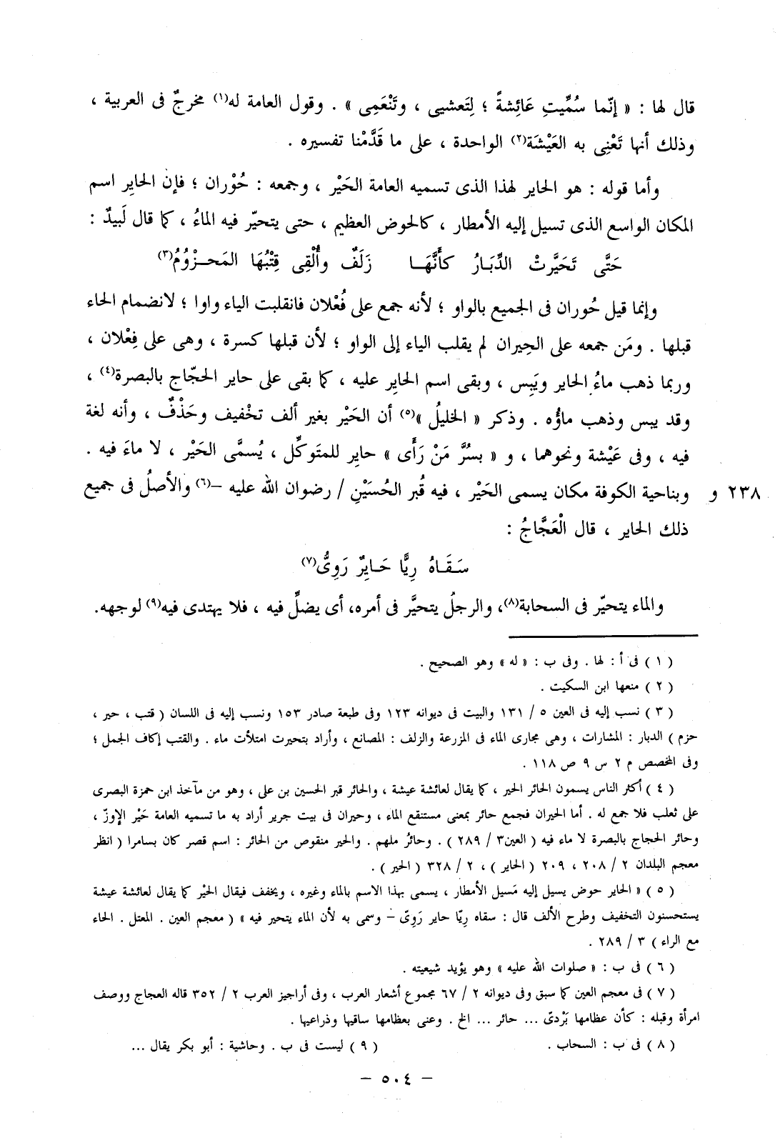 وإنما قيل حوران في الجميع بالواو؛ لأنه جمع على فعلان فانقلبت الياء واواً، لانضمام الحاء قبلها. ومن جمعه على الحيران لم يقلب الياء إلى الواو؛ لأن قبلها كسرة، وهى على فعلان، وربما ذهب ماء الحاير ويبس، وبقى اسم الحاير عليه، كما بقى على حاير الحجاج بالبصرة، وقد يبس وذهب ماؤه. وذكر "الخليل" أن الحير بغير ألف تخفيف وحذف، وأنه لغة فيه، وفي عيشة ونحوهما، و "يسر من رأى" حاير للمتوكل، يسمى الحير، لا ماء فيه. وبناحية الكوفة مكان يسمى الحير، فيه قبر الحسين / رضوان الله عليه – والأصل في جميع ذلك الحاير، قال العجاج:
