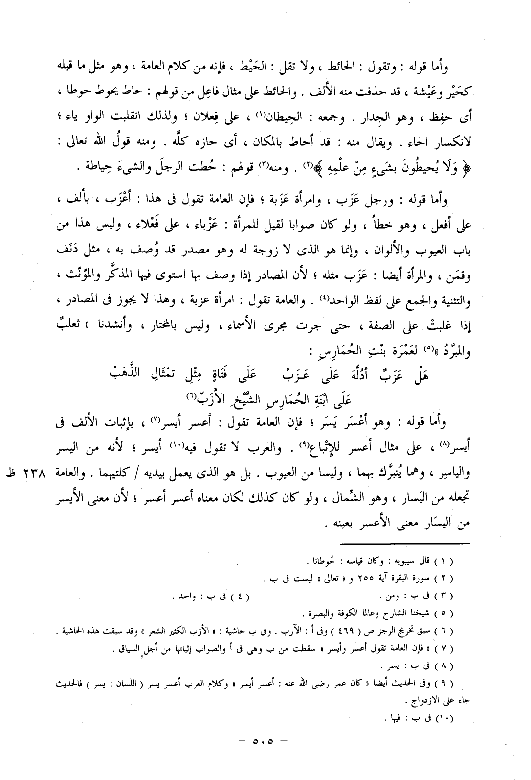 وأما قوله: وتقول: الحائط، ولا تقل: الحيط، فإنه من كلام العامة، وهو مثل ما قبله كحير وعيشة، قد حذفت منه الألف. والحائط على مثال فاعل من قولهم: حاط يحوط حوطا، أي حفظ، وهو الجدار. وجمعه: الحيطان، على فعلان؛ ولذلك انقلبت الواو ياء؛ لانكسار الحاء. ويقال منه: قد أحاط بالمكان، أي حازه كله. ومنه قول الله تعالى: (ولا يُحِيطُونَ بِشَيْءٍ مِّنْ عِلْمِهِ). ومنه قولهم: حطت الرجل والشيء حياطة.