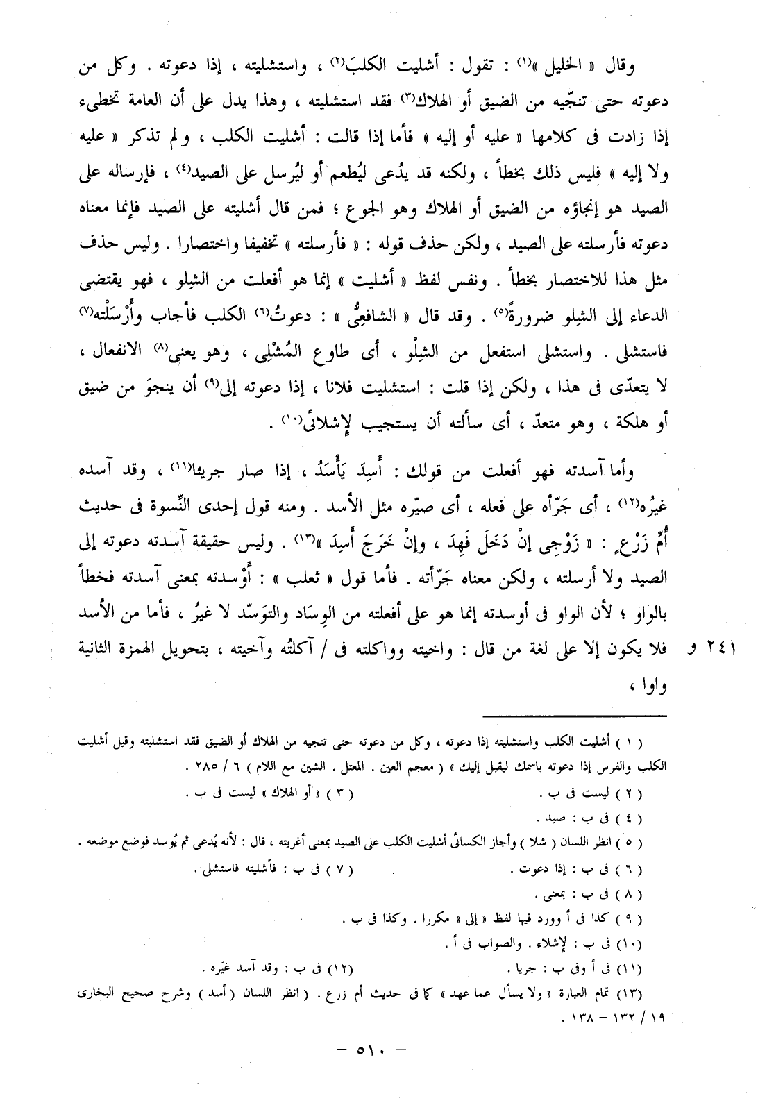 وقال "الخليل": تقول: أشليت الكلب، واستشليته، إذا دعوته. وكل من دعوته حتى تنجيه من الضيق أو الهلاك فقد استشليته، وهذا يدل على أن العامة تخطئ إذا زادت في كلامها "عليه أو إليه" فأما إذا قالت: أشليت الكلب، ولم تذكر "عليه ولا إليه" فليس ذلك بخطأ، ولكنه قد يدعى ليطعم أو ليرسل على الصيد، فإرساله على الصيد هو إنجاؤه من الضيق أو الهلاك وهو الجوع؛ فمن قال أشليته على الصيد فإنما معناه دعوته فأرسلته على الصيد، ولكن حذف قوله: "فأرسلته" تخفيفا واختصارا. وليس حذف مثل هذا للاختصار بخطأأ. ونفس لفظ "أشليت" إنما هو أفعلت من الشلو، فهو يقتضي الدعاء إلى الشلو ضرورة. وقد قال "الشافعي": دعوت الكلب فأجاب وأرسلته فاستشلى. واستشلى استفعل من الشلو، أي طاوع المشلي، وهو يعني الانفعال، لا يتعدى في هذا، ولكن إذا قلت: استشليت فلانا، إذا دعوته إلى أن ينجو من ضيق أو هلكة، وهو متعد، أي سألته أن يستجيب لإشلائي.