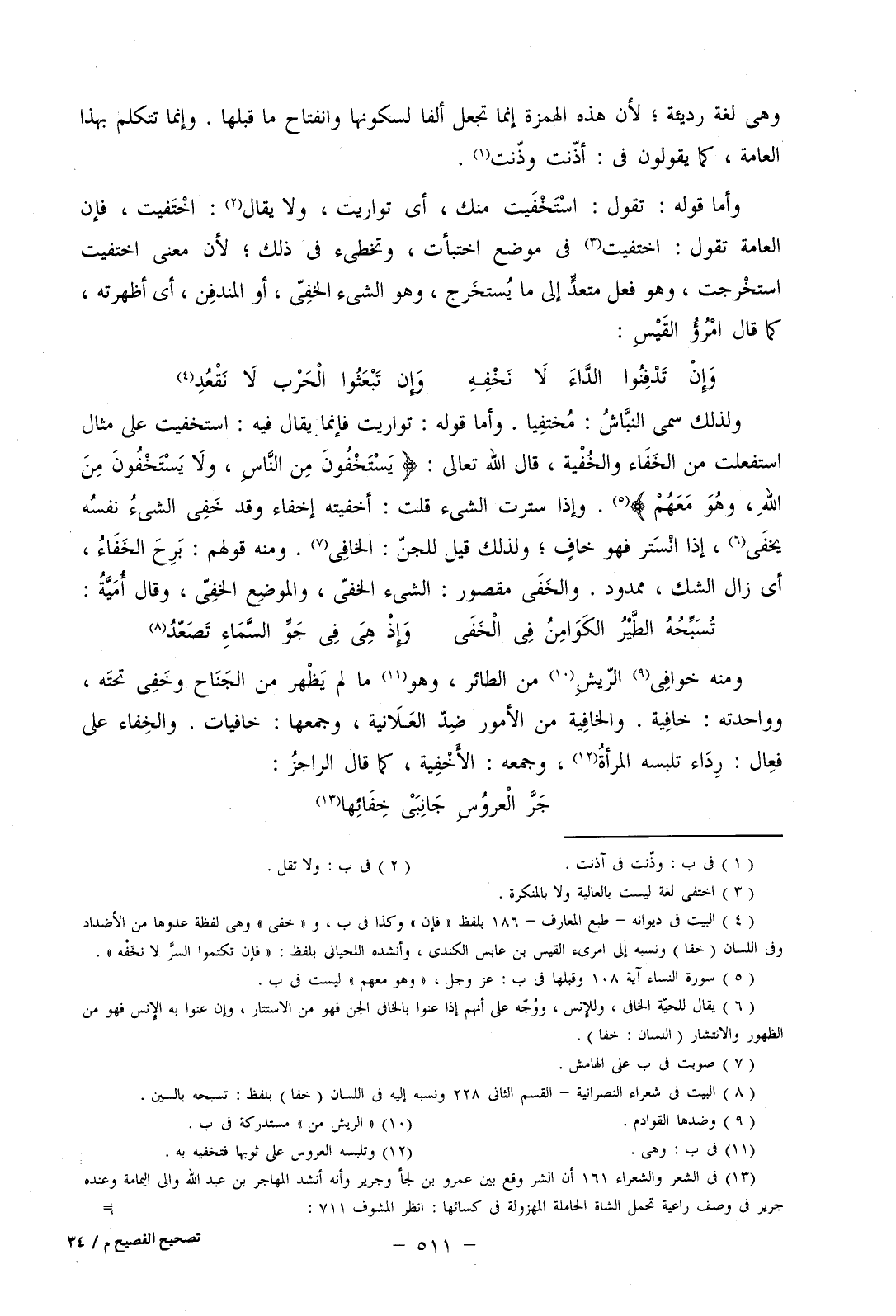 وأما قوله: تقولك استخفيت منك، أي تواريت، ولا يقال: اختفيت، فإن العامة تقول: اختفيت في موضع اختبأت، وتخطئ في ذلك؛ لأن معنى اختفيت استخرجت، وهو فعل متعد إلى ما يستخرج، وهو الشيء الخفي، أو المندفن، أي أظهرته، كما قال امرؤ القيس: