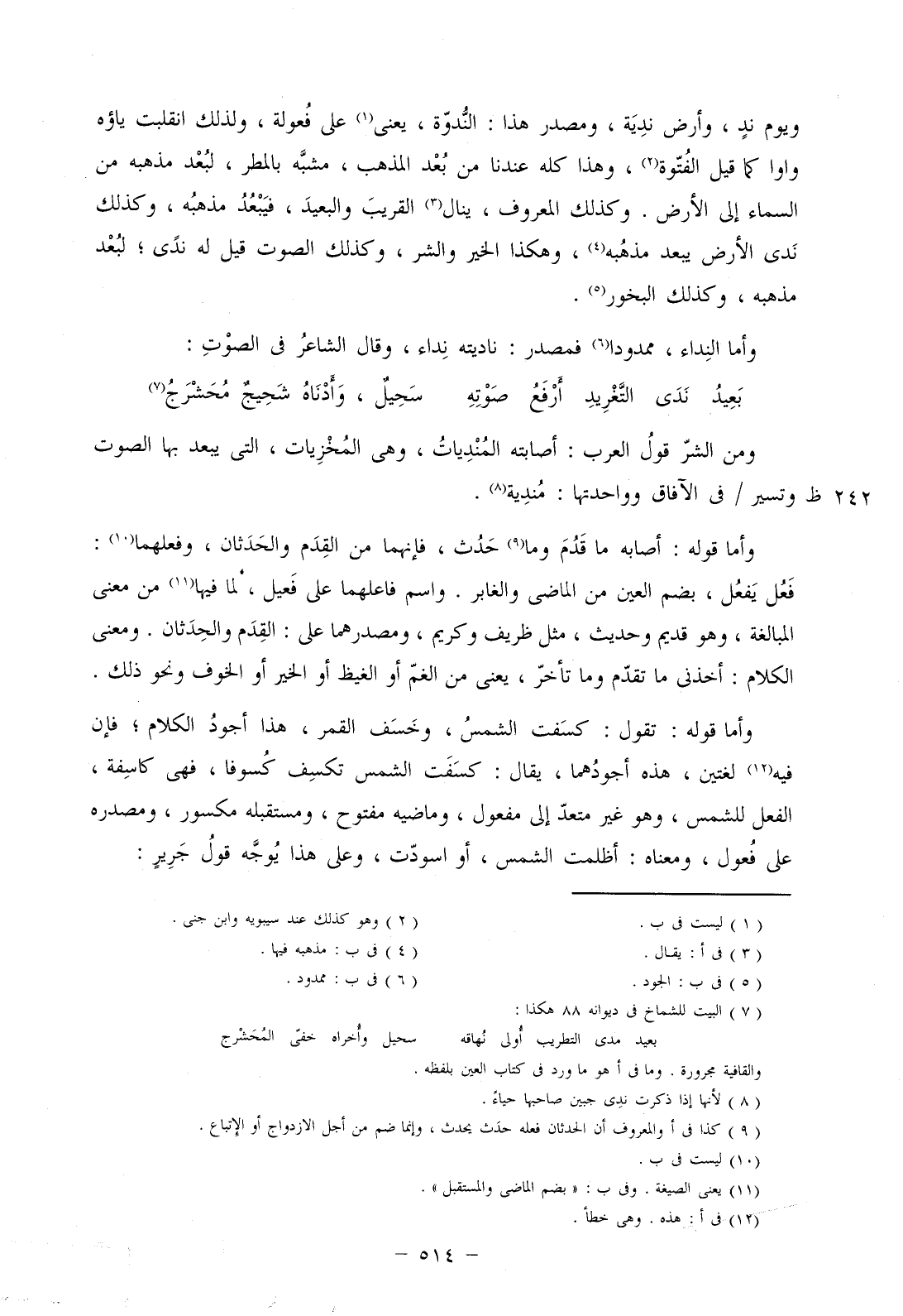 ويوم ند، وأرض ندية، ومصدر هذا: الندوة، يعني على فعولة، ولذلك انقلبت ياؤه واوا كما قيل الفتوة، وهذا كله عندنا من بعد المذهب، مشبه بالمطر، لبعد مذهبه من السماء إلى الأرض. وكذلك المعروف، ينال القريب والبعيد، فيبعهد مذهبه، وكذلك ندى الأرض يبعد مذهبه، وهكذا الخير والشر، وكذلك الصوت قيل له ندى؛ لبعد مذهبه، وكذلك البخور.