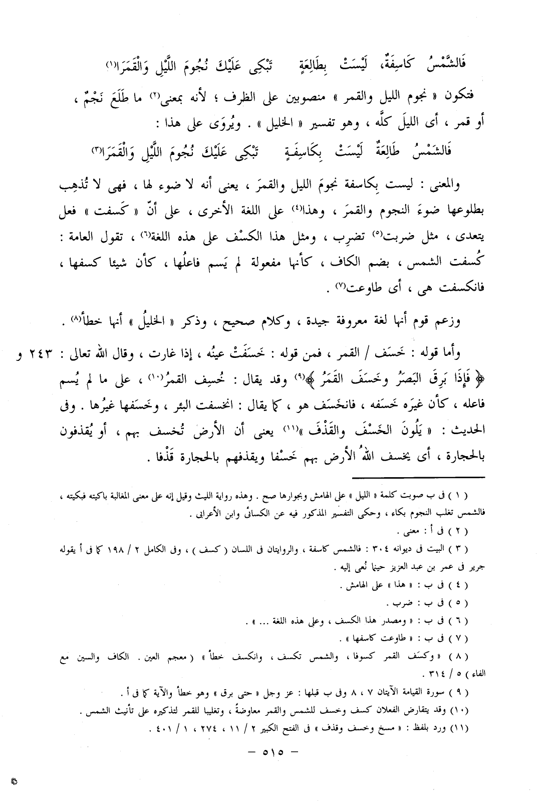 والمعنى: ليست بكاسفة نجوم الليل والقمر، يعني أنه لا ضوء لها، فهي لا تذهب بطلوعها ضوء النجوم والقمر، وهذا على اللغة الأخرى، على أن "كسفت" فعل يتعدى، مثل ضربت تضرب، ومثل هذا الكسف على هذه اللغة، تقول العامة: كسفت الشمس، بضم الكاف، كأنها مفعولة لم يسم فاعلها، كأن شيئا كسفها، فانكسفت هي، أي طاوعت.