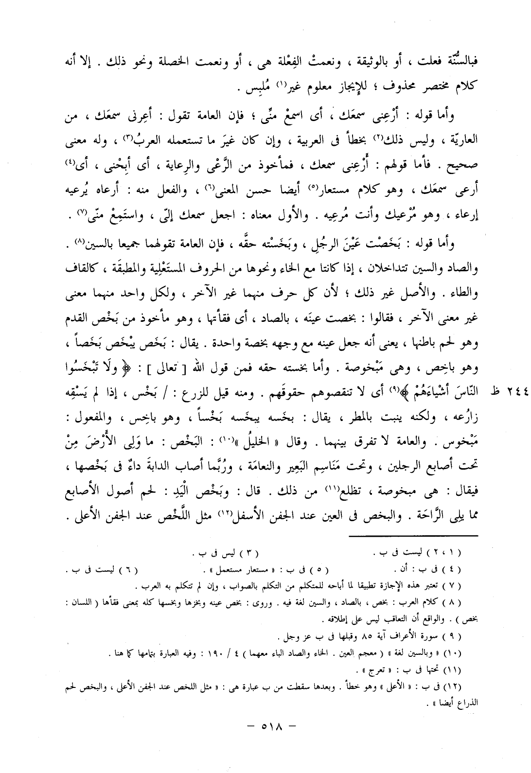 وأما قوله: بخصت عين الرجل، وبخسته حقه، فإن العامة تقولهما جميعا بالسين. والصاد والسين تتداخلان، إذا كانتا مع الخاء ونحوها من الحروف المستعلية والمطبقة، كالقاف والطاء. والأصل غير ذلك؛ لأن كل حرف منهما غير الآخر، ولكل واحد منهما معنى غير معنى الآخر، فقالوا: بخصت عينه، بالصاد، أي فقأتها، وهو مأخذو من بخص القدم وهو لحم باطنها، يعني أنه جعل عينه مع وجهه بخصة واحدة. يقال: بخص يبخص بخصا، وهو باخص، وهي مبخوصة. وأما بخسته حقه فمن قول الله [تعالى]: (ولا تَبْخَسُوا النَّاسَ أَشْيَاءَهُمْ) أي لا تنقصوهم حقوقهم. ومنه قيل للزرع: /بخس، إذا لم يسقه زراعه، ولكنه ينبت بالمطر، يقال: بخسته يبخسه بخسا، وهو باخس، والمفعول: مبخوس. والعامة لا تفرق بينهما. وقال "الخليل": البخص: ما ولي الأرض من تحت أصابع الرجلين، وتحت مناسم البعير والنعامة، وربما أصاب الدابة داء في بخصها، يقال: هي مبخوصة، تظلع من ذلك. قال: وبخص اليد: لحم أصول الأصابع مما يلي الراحة. والبخص في العين عند الجفن الأسفل مثل اللخص عند الجفن الأعلى.