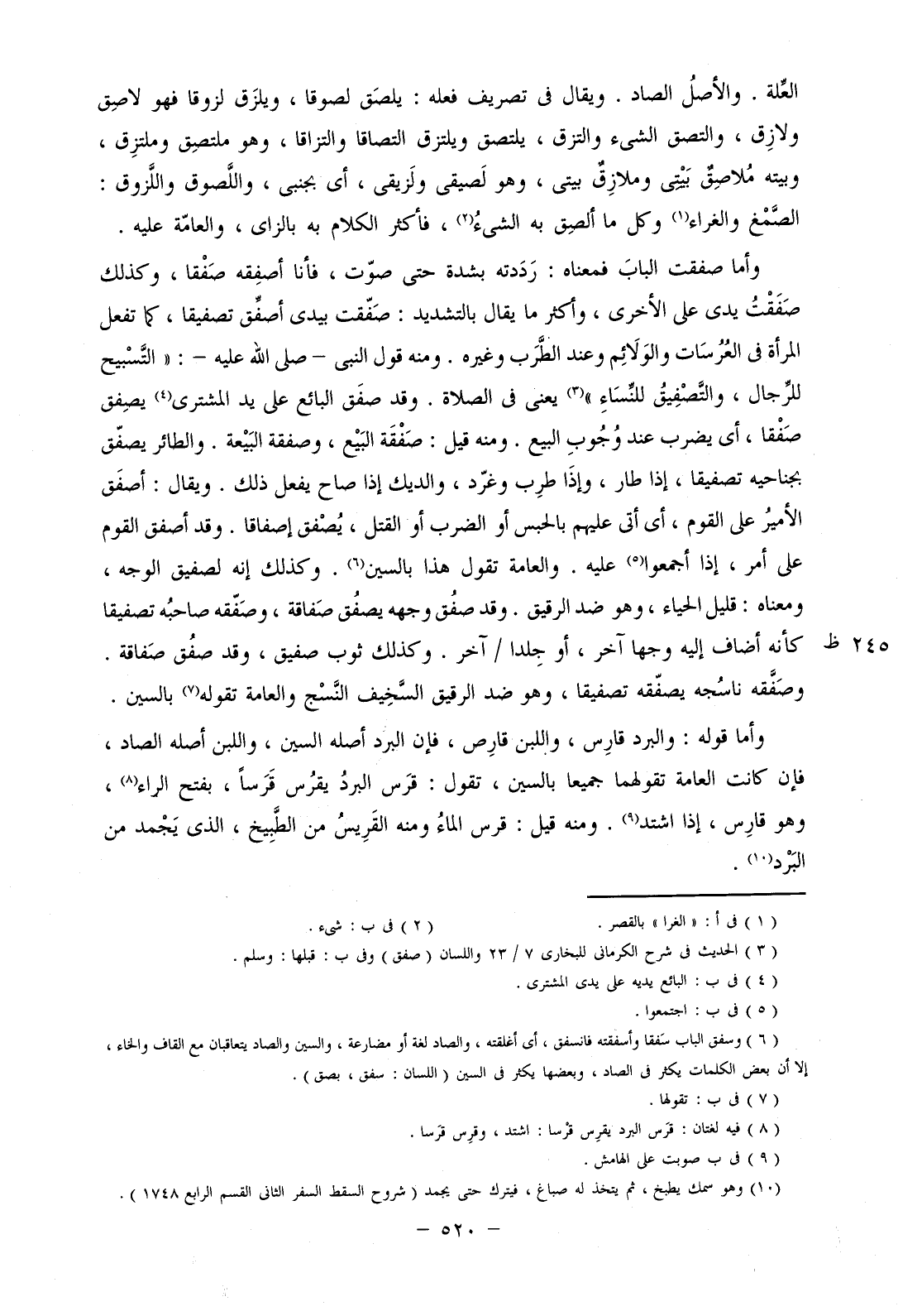 وأما صفقت الباب فمعناه: رددته بشدة حتى صوت، فأنا أصفقه صفقا، وكذلك صفقت يدي على الأخرى، وأكثر ما يقال بالتشديد: صفقت بيدي أصفق تصفيقا، كما تفعل المرأة في العرسات والولاءم وعند الطرب وغيره. ومنه قول النبي- صلى الله عليه-: "التسبيح للرجال، والتصفيق للنساء" يعني في الصلاة. وقد صفق البائع على يد المشتري يصفق صفقا، أي يضرب عند وجوب البيع. ومنه قيل: صفقة البيع، وصفقة البيعة. والطائر يصفق بجناحية تصفيقا، إذا طار، وإذا طرب وغرد، والديك إذا صاح يفعل ذلك. ويقال: أصفق الأمير على القوم، أي أتى عليهم بالحبس أو الضرب أو القتل، يصفق إصفاقا. وقد أصفق القوم على أمر، إذا أجمعوا عليه. والعامة تقول هذا بالسين. وكذلك إنه لصفيق الوجه، ومعناه: قليل الحياء، وهو ضد الرقيق. وقد صفق وجهه يصفق صفاقة، وصفقه صاحبه تصفيقا كأنه أضاف إليه وجها آخر، أو جلدا/ آخر. وكذلك ثوب صفيق، وقد صفق صفاقة. وصفقه ناسجه يصفقه تصفيقا، وهو ضد الرقيق السخيف النسج والعامة تقوله بالسين.