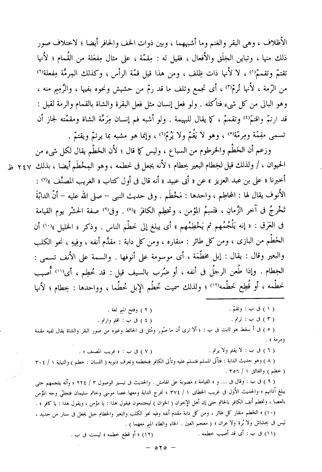 وزعم أن الخطم والخرطوم من السباع، وليس كما قال؛ لأن الخطم يقال لكل شيء من الحيوان،/ ولذلك قيل لخطام البعير خطام؛ لأنه يجعل في خطمه، وهو المخطم أيضا، بذلك أخبرنا "علي بن عبد العزيز" عن "أبي عبيد" أنه قال في أول كتاب "الغريب المصنف": الأنوف يقال لها: المخاطم، واحدها: مخطم. وفي حديث النبي- صلى الله عليه- أن الدابة تخرج في آخر الزمان، فتسم المؤمن، وتخطم الكافر". وفي صفة الحشر يوم القيامة في العرق: "إنه يلجمهم ثم يخطمهم" أي يبلغ إلى خطم الناس. وذكر "الخليل" أن الخطم من البازي، ومنكل طائر: منقاره، ومن كل دابة: مقدم أنفه، وفيه، نحو الكلب والبعير وقال: يقال: إبل مخطمة، أي موسومة على أنوفها. والسمة على الأنف تسمى: الخطام. وإذا طعن الرجل في أنفه، أو ضرب بالسيف قيل: قد خطم، أي أصيب خطمه، أو قطع خطمه؛ ولذلك سميت خطم الإبل خطما، وواحدها: خطام؛ لأنها