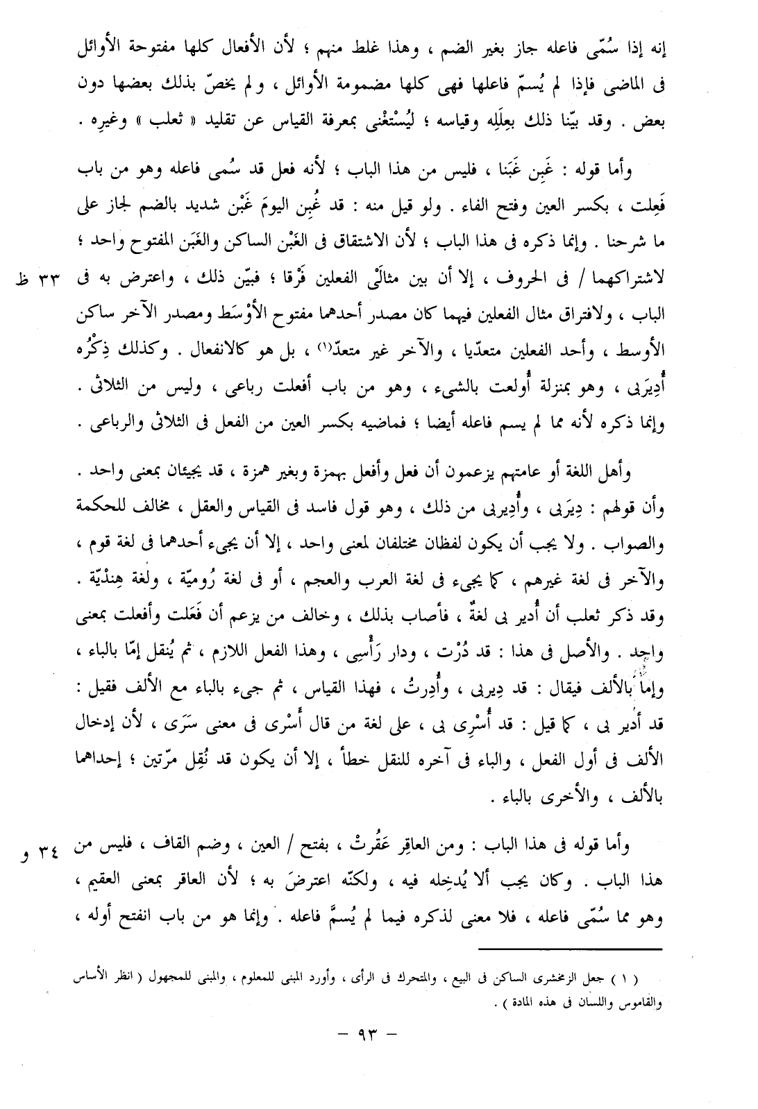 وأهل اللغة أو عامتهم يزعمون أن فعل وأفعل بهمزة وبغير همزة، قد يجيئان بمعنى واحد. وأن قولهم: ديربي، وأديربي من ذلك، وهو قول فاسد في القياس والعقل، مخالف للحكمة والصواب. ولا يجب أن يكون لفظان مختلفان لمعنى واحد، إلا أن يجيء أحدهما في لغة قوم، والآخر في لغة غيرهم، كما يجيء في لغة العرب والعجم، أو في لغة رومية، ولغة هندية. وقد ذكر ثعلب أن أدير بي لغة، فأصاب بذلك، وخالف من يزعم أن فعلت وأفعلت بمعنى واحد. والأصل في هذا: قد درت، ودار رأسي، وهذا الفعل اللازم، ثم ينقل إما بالباء، وإما بالألف فيقال: قد ديربي، وأدرت، فهذا القياس، ثم جيء بالباء مع الألف فقيل: قد أدير بي، كما قيل: قد أسري بي، على لغة من قال أسرى في معنى سرى، لأن إدخال الألف في أول الفعل، والباء في آخره للنقل خطأ، إلا أن يكون قد نقل مرتين؛ إحداهما بالألف، والأخرى بالباء.