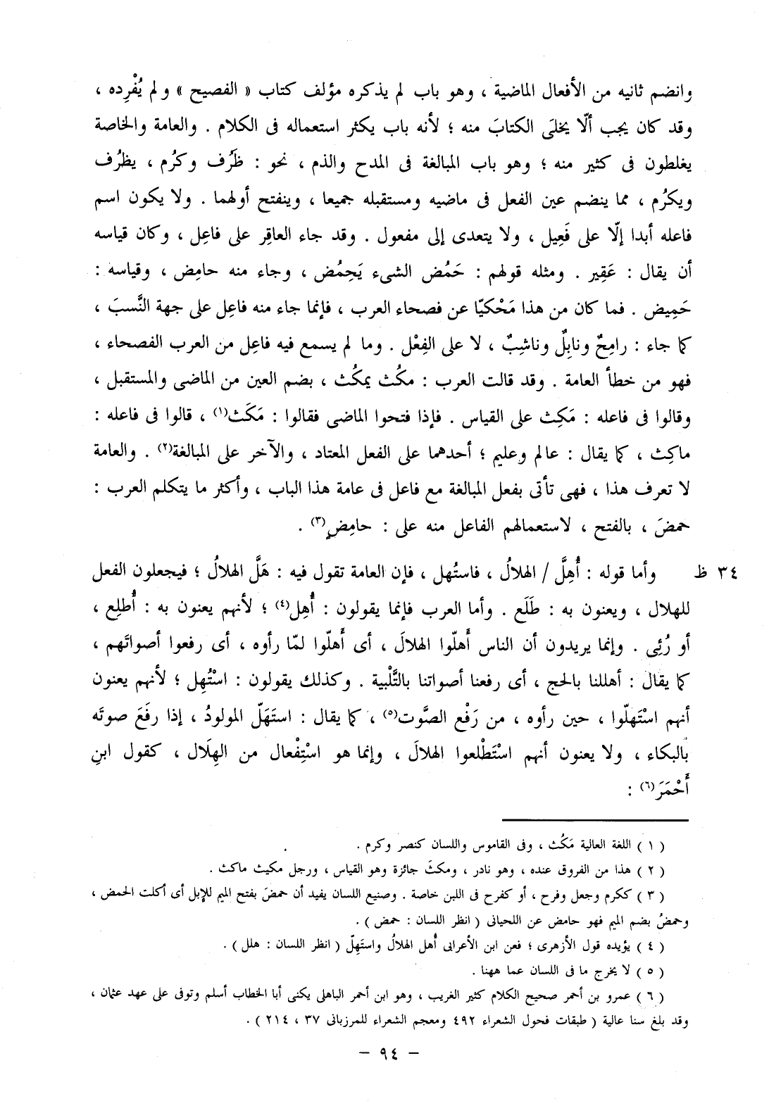 وانضم ثانيه من الأفعال الماضية، وهو باب لم يذكره مؤلف كتاب "الفصيح" ولم يفرده، وقد كان يجب ألا يخلي الكتاب منه؛ لأنه باب يكثر استعماله في الكلام. والعامة والخاصة يغلطون في كثير منه؛ وهو باب المبالغة في المدح والذم، نحو: ظَرُف وكرُم، يظرُف ويكرُم، مما ينضم عين الفعل في ماضيه ومستقبله جميعاً، وينفتح أولهما. ولا يكون اسم فاعله أبدا إلى على فعيل، ولا يتعدى إلى مفعول. وقد جاء العاقر على فاعل، وكان قياسه أن يقال: عقير. ومثله قولهم: حمض الشيء يحمض، وجاء منه حامض، وقياسه: حميض. فما كان من هذا محكياً عن فصحاء العرب، فإنما جاء منه فاعل على جهة النسب، كما جاء: رامح ونابل وناشب، لا على الفعل. وما لم يسمع فيه فاعل من العرب الفصحاء، فهو من خطأ العامة. وقد قالت العرب: مكث يمكث، بضم العين من الماضي والمستقبل، وقالوا في فاعله: مكث على القياس. فإذا فتحوا الماضي فقالوا: مكث، قالوا في فاعله: ماكث، كما يقال: عالم وعليم؛ أحدهما على الفعل المعتاد، والآخر على المبالغة. والعامة لا تعرف هذا، فهي تأتي بفعل المبالغة مع فاعل في عامة هذا الباب، وأكثر ما يتكلم العرب: حمض، بالفتح، لاستعمالهم الفاعل منه على: حامض.
