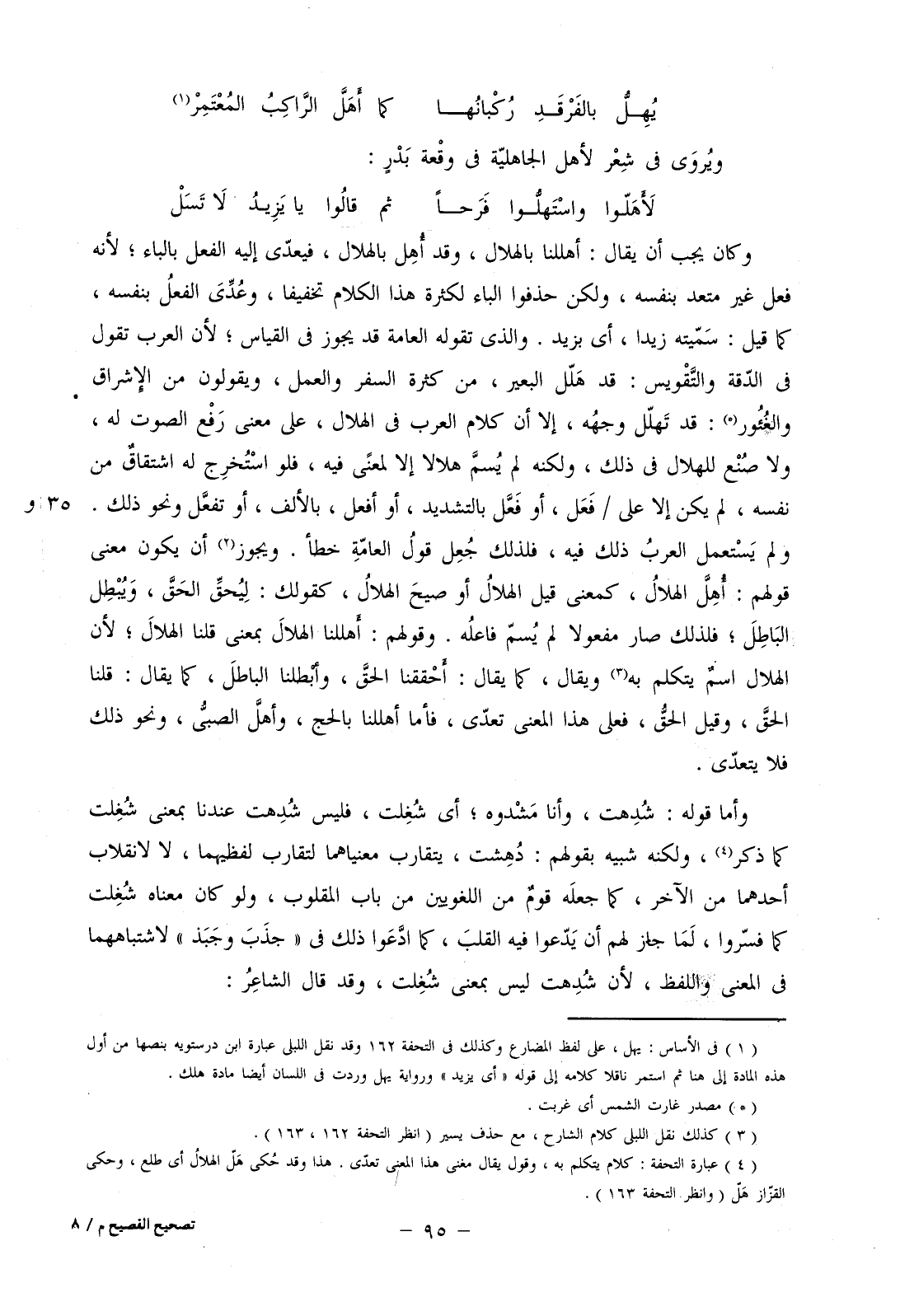 وكان يجب أن يقال: أهللنا بالهلال، وقد أُهِل بالهلال، فيعدى إليه الفعل بالباء؛ لأنه فعل غير متعد بنفسه، ولكن حذفوا الباء لكثرة هذا الكلام تخفيفاً، وعدي الفعل بنفسه، كما قيل: سميته زيداً، أي بزيد. والذي تقوله العامة قد يجوز في القياس؛ لأن العرب تقول في الدقة والتقويس: قد هلل البعير، من كثرة السفر والعمل، ويقولون من الإشراق والغُئُور: قد تهلل وجهه، إلا أن كلام العرب في الهلال، على معنى رفع الصوت له، ولا صنع للهلال في ذلك، ولكنه لم يسم هلالاً إلا لمعنى فيه، فلو استخرج له اشتقاق من نفسه، لم يكن إلى على/فعل، أو فعل بالتشديد، أو أفعل، بالألف، أو تفعل ونحو ذلك. ولم يستعمل العرب ذلك فيه، فلذلك جعل قول العامة خطأ. ويجوز أن يكون معنى قولهم: أهل الهلال، كمعنى قيل الهلال أو صيح الهلال، كقولك: ليحق الحق، ويبطل الباطل؛ فلذلك صار مفعولاً لم يسم فاعله. وقولهم: أهللنا الهلال بمعنى قلنا الهلال؛ لأن الهلال اسم يتكلم به ويقال، كما يقال: أحققنا الحق، وأبطلنا الباطل، كما يقال: قلنا الحق، وقيل الحق، فعلى هذا المعنى تعدى، فأما أهللناه بالحج، وأهل الصبي، ونحو ذلك فلا يتعدى.