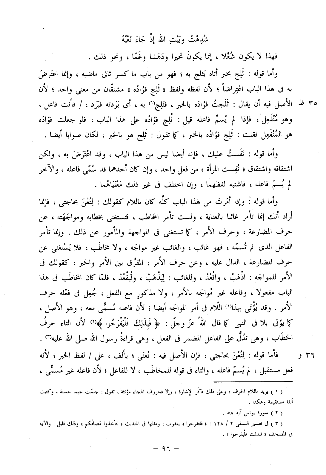 وأما قوله: وإذا أمرت من هذا الباب كله كان باللام كقولك: لتعن بحاجتي، فإنما أراد أنك إنما تأمر غائباً بالعناية، ولست تأمر المخاطب، فتستغني بخطابه ومواجهته، عن حرف المضارعة، وحرف الأمر، كما تستغني في المواجهة والمأمور عن ذلك. وإنما تأمر الفاعل الذي لم تسمه، فهو غائب، والغائب غير مواجه، ولا مخاطب، فلا يستغنى عن حرف المضارعة، الدال عليه، وعن حرف الأمر، المفرق بين الأمر والخبر، كقولك في الأمر للمواجه: اذهب، واقعد، وللغائب: ليذهب، وليقعد، فلما كان المخاطب في هذا الباب مفعولاً، وفاعله غير مواجه بالأمر، ولا مذكور مع الفعل، جعل في فعله حرف الأمر. وقد يؤتى بهذا اللام في أمر المواجه أيضاً؛ لأن فاعله مسمى معه، وهو الأصل، كما يؤتى بلا النهي كما قال الله عز وجل: (فَبِذَلِكَ فَلْيَفْرَحُوا) لأن التاء حرف الخطاب، وهي تدل على الفاعل المضمر في الفعل، وهي قراءة رسول الله صلى الله عليه.