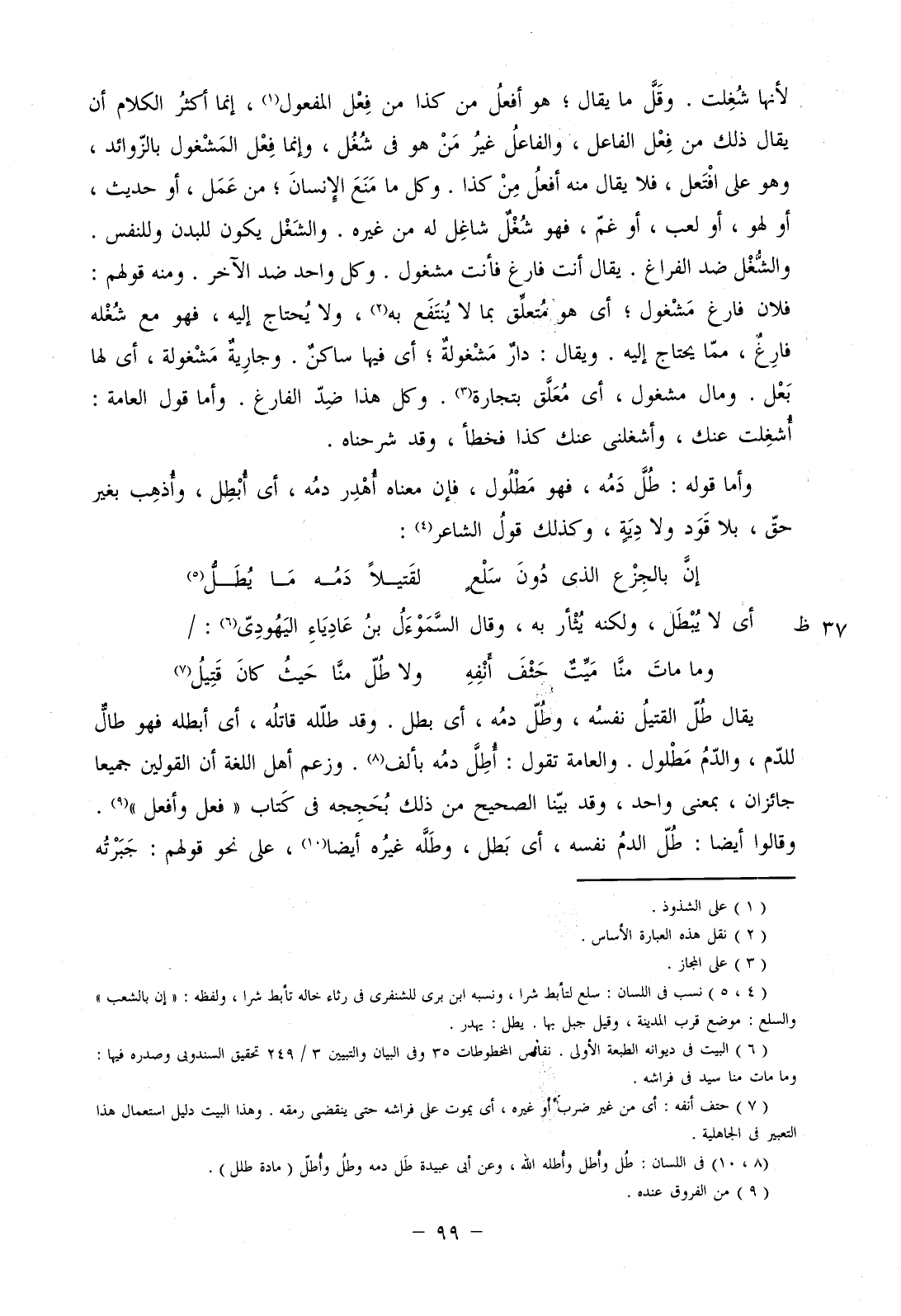 يقال طل القتيل نفسه، وطل دمه، أي بطل. وقد طلله قاتله، أي أبطله لهو طال للدم، والدم مطلول. والعامة تقول: أطل دمه بألف. وزعم أهل اللغة أن القولين جميعاً جائزان، بمعنى واحد، وقد بينا الصحيح من ذلك بحججه في كتاب "فعل وأفعل". وقالوا أيضا: طل الدم نفسه، أي بطل، وطله غيره أيضا، على نحو قولهم: جبرته