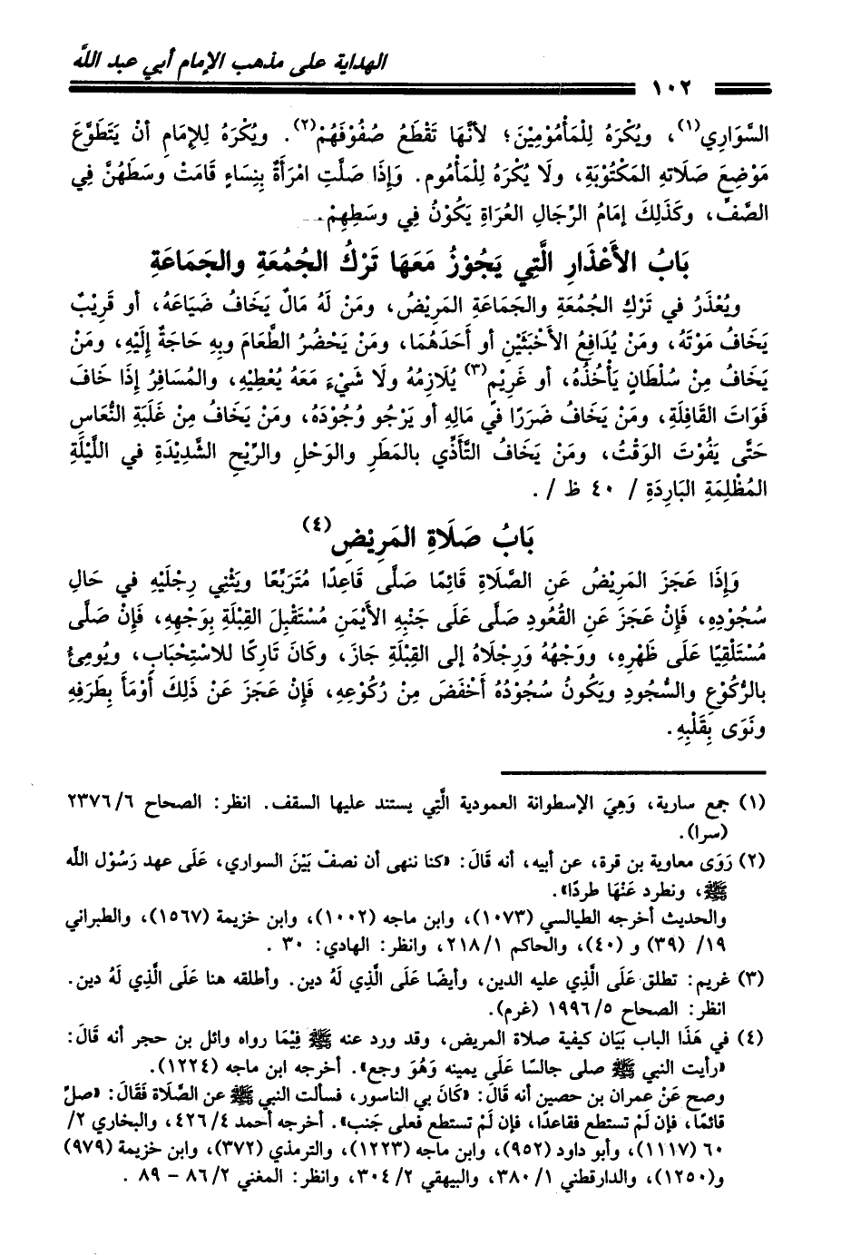 (¬4) في هَذَا الباب بَيَان كيفية صلاة المريض، وقد ورد عنه - صلى الله عليه وسلم - فِيْمَا رواه وائل بن حجر أنه قَالَ: ((رأيت النبي - صلى الله عليه وسلم - صلى جالساً عَلَى يمينه وَهُوَ وجع)). أخرجه ابن ماجه (1224).