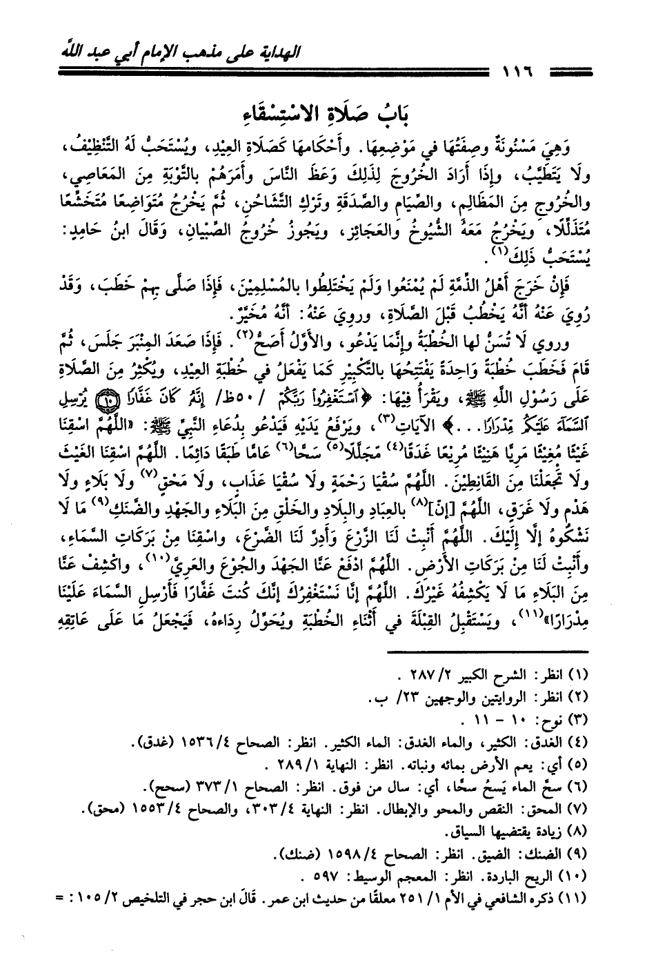 وَهِيَ مَسْنُونَةٌ وصِفَتُهَا في مَوْضِعِهَا. وأَحْكَامهَا كَصَلاَةِ العِيْدِ، ويُسْتَحَبُّ لَهُ التَّنْظِيْفُ، ولاَ يَتَطَيَّبُ، وإِذَا أَرَادَ الخُرُوجَ لِذَلِكَ وَعَظَ النَّاسَ وأَمَرَهُمْ بالتَّوْبَةِ مِنَ المَعَاصِي، والخُرُوجِ مِنَ المَظَالِمِ، والصِّيَامِ والصَّدَقَةِ وتَرْكِ التَّشَاحُنِ، ثُمَّ يَخْرُجُ مُتَوَاضِعاً مُتَخَشِّعاً مُتَذَلِّلاً، ويَخْرُجُ مَعَهُ الشُّيُوخُ والعَجَائِزِ، ويَجُوزُ خُرُوجُ الصِّبْيانِ، وَقَالَ ابنُ حَامِدٍ: يُسْتَحَبُّ ذَلِكَ (¬1).
