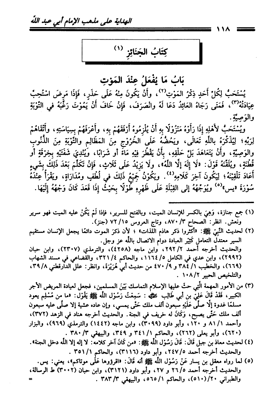 يُسْتَحَبُّ لِكُلِّ أَحَدٍ ذِكْرُ المَوْتِ (¬2)، وأَنْ يَكُونَ مِنْهُ عَلَى حَذَرٍ، فَإِذَا مَرِضَ اسْتُحِبَّ عِيَادَتُهُ (¬3)، فَمَتَى رَجَاهُ العَائِدُ دَعَا لَهُ وانْصَرَفَ، فَإِنْ خَافَ أَنْ يَمُوْتَ رَغَّبَهُ في في التَّوْبَةِ والوَصِيَّةِ.