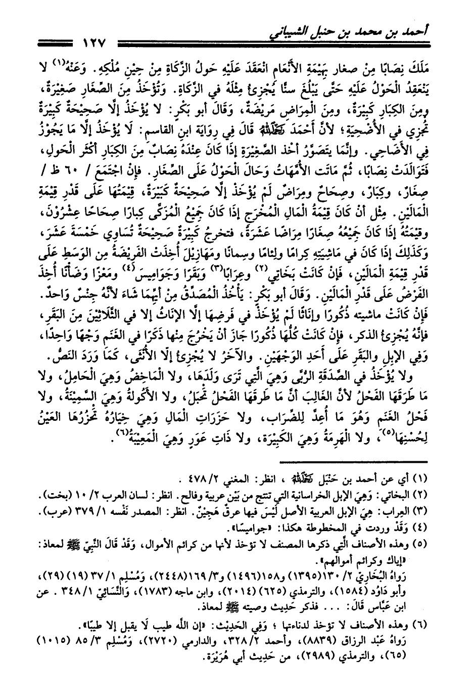 مَلَكَ نِصَاباً مِنْ صغار بَهِيْمَةِ الأَنْعَامِ انْعَقَدَ عَلَيْهِ حَولُ الزَّكَاةِ مِنْ حِيْنِ مُلْكِهِ. وَعَنْهُ (¬1) لا يَنْعَقِدُ الْحَوْلُ عَلَيْهِ حَتَّى يَبْلُغَ سنّاً يُجْزِئُ مِثْلَهُ في الزَّكَاةِ. وَتُؤْخَذُ مِنَ الصِّغَارِ صَغِيْرَةٌ، ومِنَ الكِبَارِ كَبِيْرَةٌ، ومِنَ الْمِرَاضِ مَريْضَةٌ، وَقَالَ أبو بَكْرٍ: لا يُؤْخَذُ إلاَّ صَحِيْحَةٌ كَبِيْرَةٌ تُجْزِي في الأُضْحِيَةِ؛ لأنَّ أَحْمَدَ - رضي الله عنه - قَالَ فِي رِوَايَة ابنِ القاسمِ: لاَ يُؤْخَذُ إلاَّ مَا يَجُوْزُ فِي الأَضَاحِي. وإنَّمَا يتَصَوَّرُ أخْذ الصَّغِيْرَةِ إذَا كَانَ عِنْدَهُ نِصَابٌ مِنَ الكِبَارِ أكْثَر الْحَولِ، فَتَوَالَدَتْ نِصَاباً، ثُمَّ مَاتَتْ الأُمَّهَاتُ وَحَالَ الْحَوْلُ عَلَى الصِّغَارِ. فإِنْ اجْتَمَعَ / 60 ظ / صِغَارٌ، وكِبَارٌ، وصِحَاحٌ ومِرَاضٌ لَمْ يُؤْخَذْ إلاَّ صَحِيْحَةٌ كَبَيْرَةٌ، قِيْمَتُهَا عَلَى قَدْرِ قِيْمَةِ الْمَالَيْنِ. مِثْل أنْ كَانَ قِيْمَةُ الْمَالِ الْمُخْرَجِ إذَا كَانَ جَمِيْعُ الْمُزَكَّى كِباراً صِحَاحاً عِشْرُوْنَ، وقيْمَتُهُ إذَا كَانَ جَمِيْعُهُ صِغَاراً مِرَاضاً عَشَرَةً، فتخرجُ كَبِيْرَةٌ صَحِيْحَةٌ تُسَاوِي خَمْسَةَ عَشَرَ، وَكَذَلِكَ إذَا كَانَ في مَاشِيَتِهِ كِراماً ولِئاماً وسِماناً ومَهَازِيْلَ أُخِذَتْ الفَرِيْضَةُ مِن الوَسَطِ عَلَى قَدْرِ قِيْمَةِ الْمَالَيْنِ، فَإنْ كَانَتْ بَخَاتِي (¬2) وعِرَاباً (¬3) وَبَقَراً وَجَوَامِيسَ (¬4) ومَعْزاً وَضَأْناً أُخِذَ الفَرْضُ عَلَى قَدْرِ الْمَالَيْنِ. وَقَالَ أبو بَكْرٍ: يَأْخُذُ الْمُصَدِّقُ مِنْ أيِّهِمَا شَاءَ لأنَّهُ جِنْسٌ وَاحدٌ. فَإِنْ كَانَتْ ماشيته ذُكُوراً وإنَاثاً لَمْ يُؤْخَذْ في فَرضِهَا إلاَّ الإنَاثُ إلا في الثَّلاَثِيْنَ مِنَ البَقَرِ، فإنَّهُ يُجْزِئُ الذكر، فإِنْ كَانَتْ كُلُّهَا ذُكُوراً جَازَ أنْ يَخْرُجَ مِنْها ذَكَراً في الغَنَمِ وَجْهاً وَاحِداً، وَفِي الإبِلِ والبَقَرِ عَلَى أَحَدِ الوَجْهَيْنِ. والآخَرُ لا يُجْزِئُ إلاّ الأُنْثَى، كَمَا وَرَدَ النَصُّ.