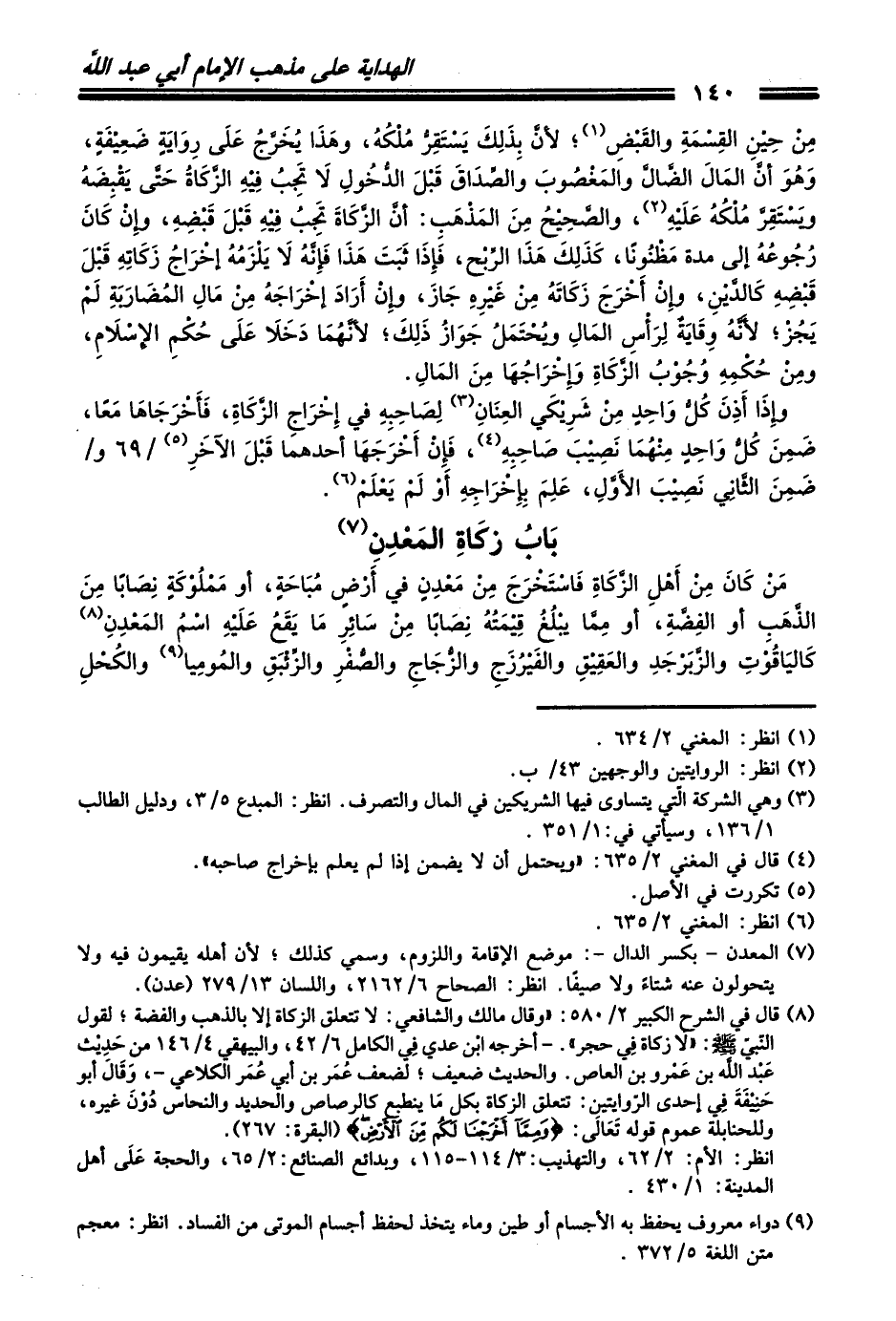 (¬8) قال في الشرح الكبير 2/ 580: ((وقال مالك والشافعي: لا تتعلق الزكاة إلا بالذهب والفضة؛ لقول النّبيّ - صلى الله عليه وسلم -: ((لاَ زكاة فِي حجر)). - أخرجه ابْن عدي فِي الكامل 6/ 42، والبيهقي 4/ 146 من حَدِيْث عَبْد الله بن عَمْرو بن العاص. والحديث ضعيف؛ لضعف عُمَر بن أبي عُمَر الكلاعي -، وَقَالَ أبو حَنِيْفَةَ فِي إحدى الرّوايتين: تتعلق الزكاة بكل مَا ينطبع كالرصاص والحديد والنحاس دُوْنَ غيره، وللحنابلة عموم قوله تَعَالَى: {وممّا أخرجنا لَكُمْ من الأرض} (البقرة: 267))).