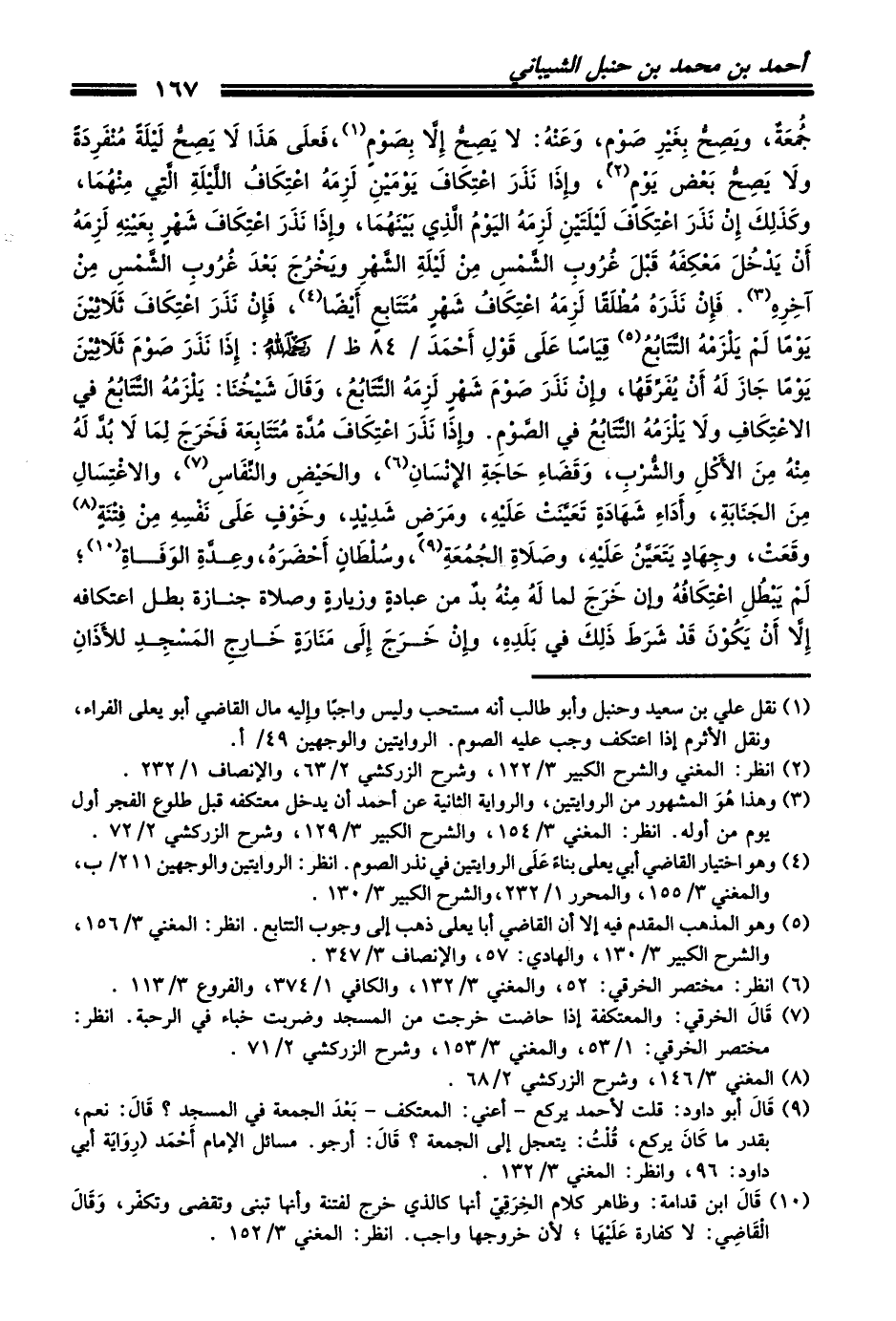 جُمُعَةٌ، ويَصِحُّ بِغَيْرِ صَوْمٍ، وَعَنْهُ: لا يَصِحُّ إِلاَّ بِصَوْمٍ (¬1)، فَعلَى هَذَا لاَ يَصِحُّ لَيْلَةً مُنْفَرِدَةً ولاَ يَصِحُّ بَعْضُ يَوْمٍ (¬2)، وإِذَا نَذَرَ اعْتِكَافَ يَوْمَيْنِ لَزِمَهُ اعْتِكَافُ اللَّيْلَةِ الَّتِي مِنْهُمَا، وكَذَلِكَ إِنْ نَذَرَ اعْتِكَافَ لَيْلَتَيْنِ لَزِمَهُ اليَوْمُ الَّذِي بَيْنَهُمَا، وإِذَا نَذَرَ اعْتِكَافَ شَهْرٍ بِعَيْنِهِ لَزِمَهُ أَنْ يَدْخُلَ مَعْكِفَهُ قَبْلَ غُرُوبِ الشَّمْسِ مِنْ لَيْلَةِ الشَّهْرِ ويَخْرُجَ بَعْدَ غُرُوبِ الشَّمْسِ مِنْ آخِرِهِ (¬3). فَإِنْ نَذَرَهُ مُطْلَقاً لَزِمَهُ اعْتِكَافُ شَهْرٍ مُتَتَابِعٍ أَيْضاً (¬4)، فَإِنْ نَذَرَ اعْتِكَافَ ثَلاَثِيْنَ يَوْماً لَمْ يَلْزَمْهُ التَّتَابُعُ (¬5) قِيَاساً عَلَى قَوْلِ أَحْمَدَ / 84 ظ / - رضي الله عنه -: إِذَا نَذَرَ صَوْمَ ثَلاَثِيْنَ يَوْماً جَازَ لَهُ أَنْ يُفَرِّقَهُا، وإِنْ نَذَرَ صَوْمَ شَهْرٍ لَزِمَهُ التَّتَابُعُ، وَقَالَ شَيْخُنَا: يَلْزَمُهُ التَّتَابُعُ في الاعْتِكَافِ ولاَ يَلْزَمُهُ التَّتَابُعُ في الصَّوْمِ. وإِذَا نَذَرَ اعْتِكَافَ مُدَّةً مُتَتَابِعَةً فَخَرَجَ لِمَا لاَ بُدَّ لَهُ مِنْهُ مِنَ الأَكْلِ والشُّرْبِ، وَقَضَاءِ حَاجَةِ الإِنْسَانِ (¬6)، والحَيْضِ والنِّفَاسِ (¬7)، والاغْتِسَالِ مِنَ الجَنَابَةِ، وأَدَاءِ شَهَادَةٍ تَعَيَّنَتْ عَلَيْهِ، ومَرَضٍ شَدِيْدٍ، وخَوْفٍ عَلَى نَفْسِهِ مِنْ فِتْنَةٍ (¬8) وقَعَتْ، وجِهَادٍ يَتَعَيَّنُ عَلَيْهِ، وصَلاَةٍ الجُمُعَةِ (¬9)، وسُلْطَانٍ أَحْضَرَهُ، وعِدَّةِ الوَفَاةِ (¬10)؛ لَمْ يَبْطُلِ اعْتِكَافُهُ وإن خَرَجَ لما لَهُ مِنْهُ بدٌ من عبادةٍ وزيارةٍ وصلاة جنازة بطل اعتكافه إِلاَّ أَنْ يَكُوْنَ قَدْ شَرَطَ ذَلِكَ في بَلَدِهِ، وإِنْ خَرَجَ إِلَى مَنَارَةٍ خَارِجِ المَسْجِدِ للأَذَانِ