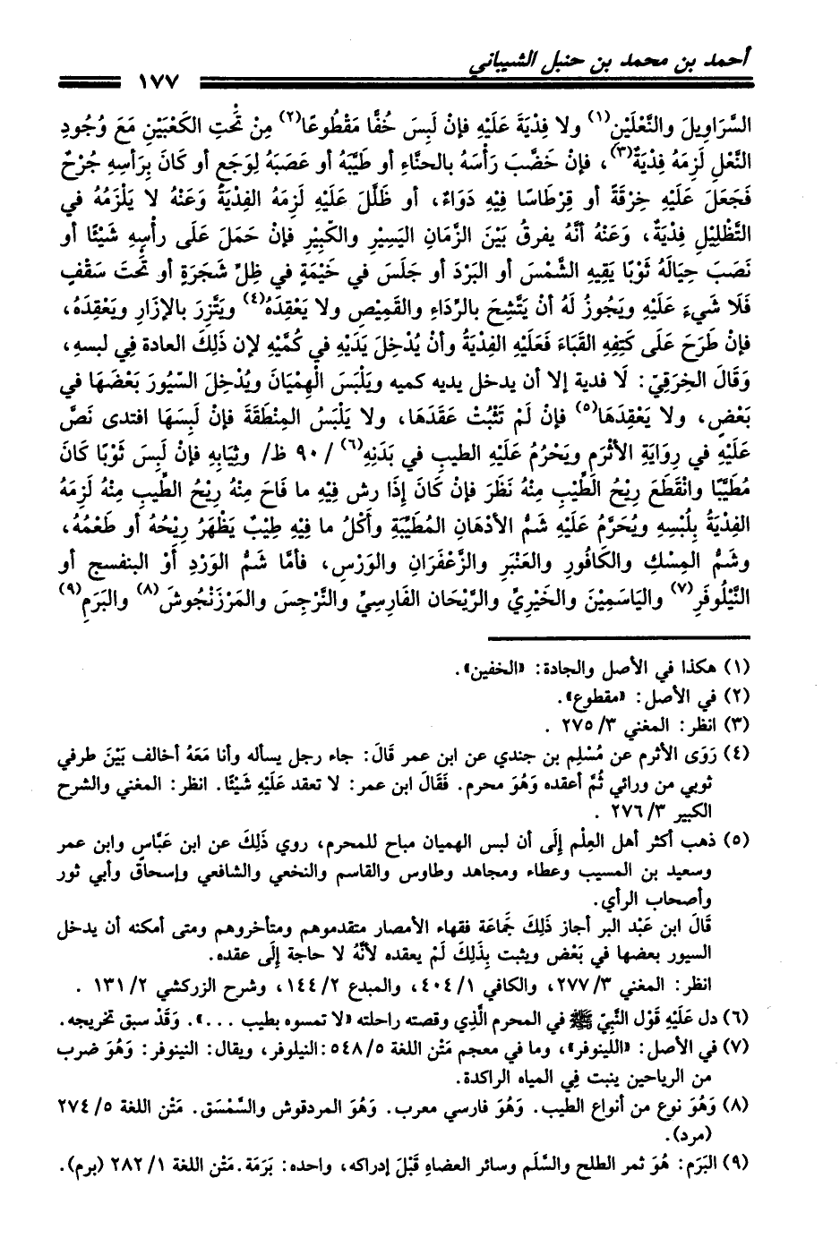 السَّرَاوِيلَ والنَّعْلَيْنِ (¬1) ولا فِدْيَةَ عَلَيْهِ فإنْ لَبِسَ خُفّاً مَقْطُوعاً (¬2) مِنْ تَحْتِ الكَعْبَيْنِ مَعَ وُجُودِ النَّعْلِ لَزِمَهُ فِدْيَةٌ (¬3)، فإنْ خَضَّبَ رَأْسَهُ بالحنَّاءِ أو طَيَّبَهُ أو عَصَبَهُ لِوَجَعٍ أو كَانَ بِرَأسِهِ جُرْحٌ فَجَعَلَ عَلَيْهِ خِرْقَةً أو قِرْطَاساً فِيْهِ دَوَاءٌ، أو ظَلَّلَ عَلَيْهِ لَزِمَهُ الفِدْيَةُ وَعَنْهُ لا يَلْزَمُهُ في التَّظْلِيْلِ فِدْيَةٌ، وَعَنْهُ أنَّهُ يفرقُ بَيْنَ الزَّمَانِ اليَسِيْرِ والكّبِيْرِ فإنْ حَمَلَ عَلَى رأْسِهِ شَيْئاً أو نَصَبَ حِيَالَهُ ثَوْباً يَقِيهِ الشَّمْسَ أو البَرْدَ أو جَلَسَ في خَيْمَةٍ في ظِلِّ شَجَرَةٍ أو تَحْتَ سَقْفٍ فَلاَ شَيءَ عَلَيْهِ ويَجُوزُ لَهُ أنْ يَتَّشِحَ بالرِّدَاءِ والقَمِيْصِ ولا يَعْقِدَهُ (¬4) ويَتَّزِرَ بالإزَارِ ويَعْقِدَهُ، فإنْ طَرَحَ عَلَى كَتِفِهِ القَبَاءَ فَعَلَيْهِ الفِدْيَةُ وأنْ يُدْخِلَ يَدَيْهِ في كُمَّيْهِ لإن ذَلِكَ العادة فِي لبسهِ، وَقَالَ الخِرَقِيّ: لاَ فدية إلا أن يدخل يديه كميه ويَلْبَسَ الْهِمْيَانَ ويُدْخِلَ السّيُورَ بَعْضَهَا في بَعْضٍ، ولا يَعْقِدَهَا (¬5) فإنْ لَمْ تَثْبُتْ عَقَدَهَا، ولا يَلْبَسُ المِنْطَقَةَ فإنْ لَبِسَهَا افتدى نَصَّ عَلَيْهِ في رِوَايَةِ الأثْرَمِ ويَحْرُمُ عَلَيْهِ الطيبِ في بَدَنِهِ (¬6) /90 ظ/ وثِيَابِهِ فإنْ لَبِسَ ثَوْباً كَانَ مُطَيَّباً وانْقَطَعَ رِيْحُ الطِّيْبِ مِنْهُ نَظَرَ فإنْ كَانَ إِذَا رش فِيْهِ ما فَاحَ مِنْهُ رِيْحُ الطِّيبِ مِنْهُ لَزِمَهُ الفِدْيَةُ بِلُبْسِهِ ويُحَرَّمُ عَلَيْهِ شَمُّ الأدْهَانِ المُطَيِّبَةِ وأَكْلُ ما فِيْهِ طِيْبٌ يَظْهَرُ رِيْحُهُ أو طَعْمُهُ، وشَمُّ المِسْكِ والكَافُورِ والعَنْبَرِ والزَّعْفَرَانِ والوَرْسِ، فأمَّا شَمُّ الوَرْدِ أَوْ البنفسج أو النَّيْلُوفَرِ (¬7) واليَاسَمِيْنَ والخَيْرِيِّ والرَّيْحَان الفَارِسِيِّ والنَّرْجِسَ والمَرْزَنْجُوشَ (¬8) والبَرَمِ (¬9)