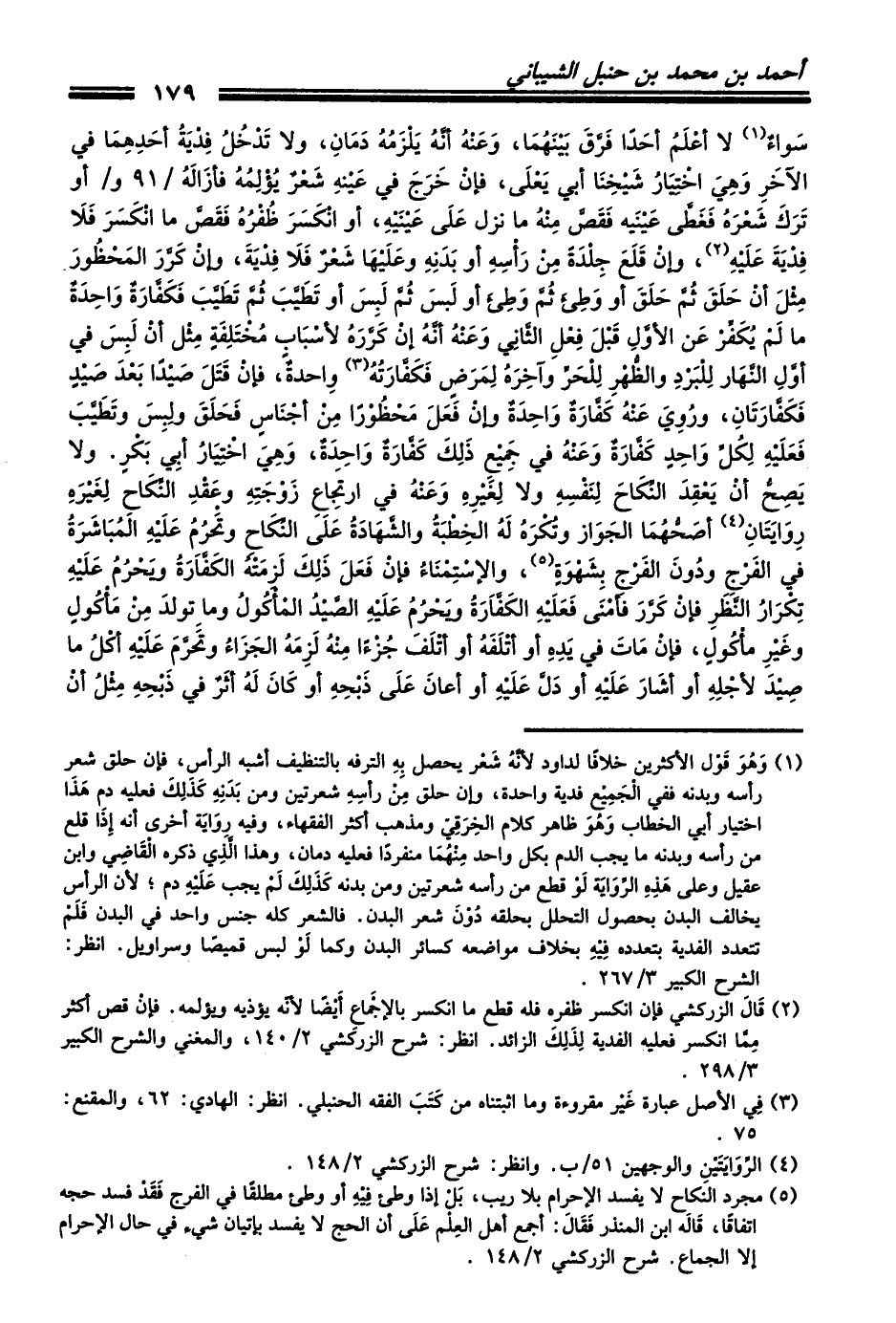 سَواءٌ (¬1) لا أعْلَمُ أحَداً فَرَّقَ بَيْنَهُمَا، وَعَنْهُ أنَّهُ يَلْزَمُهُ دَمَانِ، ولا تَدْخُلُ فِدْيَةُ أحَدِهِمَا في الآخَرِ وَهِيَ اخْتِيَارُ شَيْخِنَا أبي يَعْلَى، فإنْ خَرَجَ في عَيْنهِ شَعْرٌ يُؤْلِمُهُ فأزَالَهُ /91 و/ أو تَرَكَ شَعْرَهُ فَغَطَّى عَيْنَيه فَقَصَّ مِنْهُ ما نزل عَلَى عَيْنَيْهِ، أو انْكَسَرَ ظُفْرُهُ فَقَصَّ ما انْكَسَرَ فَلاَ فِدْيَةَ عَلَيْهِ (¬2)، وإنْ قَلَعَ جِلْدَةً مِنْ رَأْسِهِ أو بَدَنِهِ وعَلَيْهَا شَعْرٌ فَلاَ فِدْيَةَ، وإنْ كَرَّرَ المَحْظُورَ مِثْلَ أنْ حَلَقَ ثُمَّ حَلَقَ أو وَطِئَ ثُمَّ وَطِئَ أو لَبسَ ثُمَّ لَبِسَ أو تَطَيَّبَ ثُمَّ تَطَيَّبَ فَكَفَّارَةٌ وَاحِدَةٌ ما لَمْ يُكَفِّرْ عَن الأوَّلِ قَبْلَ فِعْلِ الثَّانِي وَعَنْهُ أنَّهُ إنْ كَرَّرَهُ لأسْبَابٍ مُخْتَلِفَةٍ مِثْل أنْ لَبِسَ في أوَّلِ النَّهَار لِلْبَرْدِ والظُّهْرِ لِلْحَرِّ وآخِرَهُ لِمَرَضٍ فَكَفَّارَتُهُ (¬3) وِاحدةٌ، فإنْ قَتَلَ صَيْداً بَعْدَ صَيْدٍ فَكَفَّارَتَانِ، ورُوِيَ عَنْهُ كَفَّارَةٌ وَاحِدَةٌ وإنْ فَعَلَ مَحْظُوْراً مِنْ أجْنَاسٍ فَحَلَقَ ولِبِسَ وتَطَيَّبَ فَعَلَيْهِ لِكُلِّ وَاحِدٍ كَفَّارَةٌ وَعَنْهُ في جَمِيْعِ ذَلِكَ كَفَّارَةٌ وَاحِدَةٌ، وَهِيَ اخْتِيَارُ أبِي بَكْرٍ. ولا يَصِحُّ أنْ يَعْقِدَ النِّكَاحَ لِنَفْسِهِ ولا لِغَيْرِهِ وَعَنْهُ في ارتِجَاعِ زَوْجَتِهِ وعَقْدِ النِّكَاحِ لِغَيْرَهِ رِوَايَتَانِ (¬4) أصَحُّهُمَا الجَوَازِ وتُكْرَهُ لَهُ الخِطْبَةُ والشَّهَادَةُ عَلَى النِّكَاحِ وتَحْرُمُ عَلَيْهِ المُبَاشَرَةُ في الفَرْجِ ودُونَ الفَرْجِ بِشَهْوَةٍ (¬5)، والإسْتِمْنَاءُ فإنْ فَعَلَ ذَلِكَ لَزِمَتْهُ الكَفَّاَرَةُ ويَحْرُمُ عَلَيْهِ تِكْرَارُ النَّظَرِ فإنْ كَرَّرَ فأمْنَى فَعَلَيْهِ الكَفَّاَرَةُ ويَحْرُمُ عَلَيْهِ الصَّيْدُ المْأْكُولُ وما تولدَ مِنْ مَأْكُولٍ وغَيْرِ مأْكُولٍ، فإنْ مَاتَ في يَدِهِ أو أتْلَفَهُ أو أتْلَفَ جُزْءاً مِنْهُ لَزِمَهُ الجَزَاءُ وتَحَرَّمَ عَلَيْهِ أكْلُ ما صِيْدَ لأجْلِهِ أو أشَارَ عَلَيْهِ أو دَلَّ عَلَيْهِ أو أعانَ عَلَى ذَبْحِهِ أو كَانَ لَهُ أثَرٌ في ذَبْحِهِ مِثْلُ أنْ