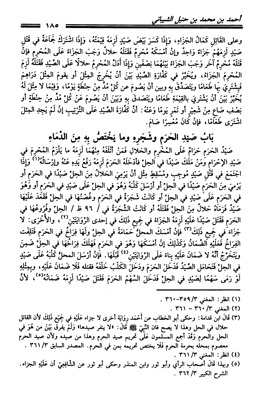 (¬3) قَالَ ابن قدامة: وحكى أبو الخطاب عن أَحْمَد رِوَايَة أخرى لا جزاء عَلَيْهِ في جَمِيْع ذَلِكَ لأن القاتل حلال في الحل وهذا لا يصح فان النَّبِيّ - صلى الله عليه وسلم - قَالَ: ((لا ينفر صيدها)) وَلَمْ يفرق بَيْنَ من هُوَ في الحل والحرم وَقَدْ أجمع المسلمون عَلَى تحريم صيد الحرم وهذا من صيده ولأن صيد الحرم معصوم بمحله بحرمة الحرم فَلاَ يختص تحريمه بمن في الحرم. المصدر السابق 3/ 361.