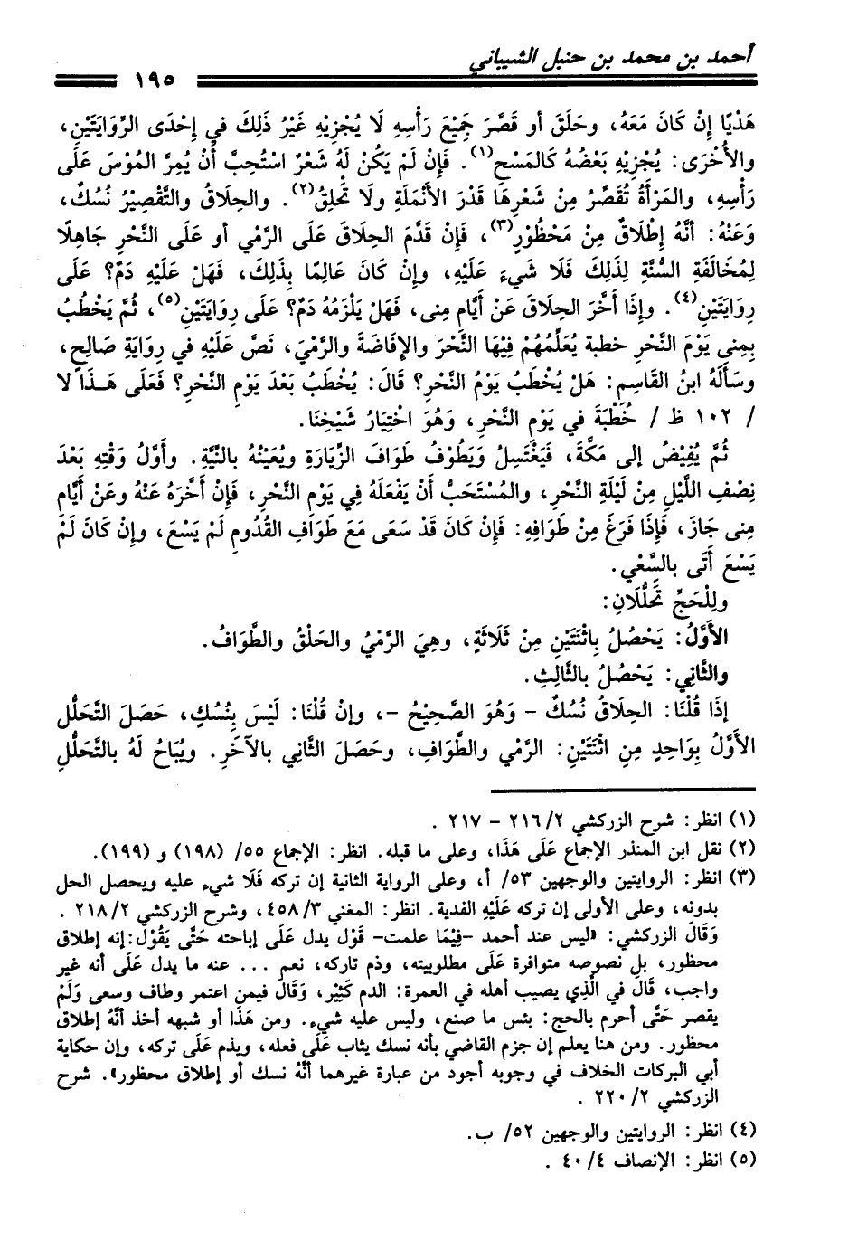 وَقَالَ الزركشي: ((ليس عند أحمد -فِيْمَا علمت- قَوْل يدل عَلَى إباحته حَتَّى يَقُوْل: إنه إطلاق محظور، بل نصوصه متوافرة عَلَى مطلوبيته، وذم تاركه، نعم ... عنه ما يدل عَلَى أنه غير واجب، قَالَ في الَّذِي يصيب أهله في العمرة: الدم كَثِيْر، وَقَالَ فيمن اعتمر وطاف وسعى وَلَمْ يقصر حَتَّى أحرم بالحج: بئس ما صنع، وليس عليه شيء. ومن هَذَا أو شبهه أخذ أنَّهُ إطلاق محظور. ومن هنا يعلم إن جزم القاضي بأنه نسك يثاب عَلَى فعله، ويذم عَلَى تركه، وإن حكاية أبي البركات الخلاف في وجوبه أجود من عبارة غيرهما أنَّهُ نسك أو إطلاق محظور)). شرح الزركشي 2/ 220.