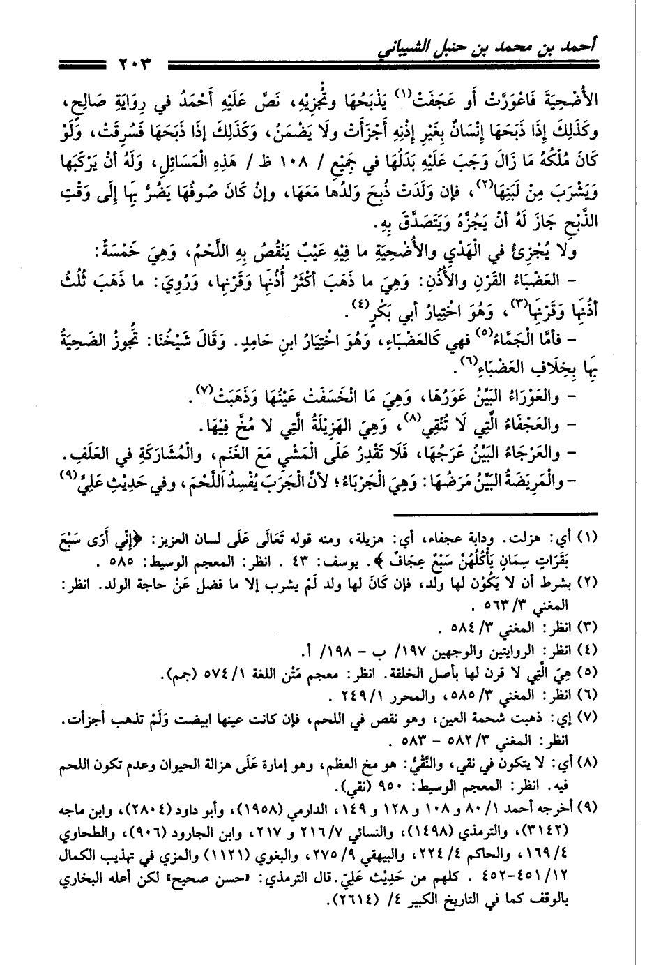 - والعَرْجَاءُ البَيِّنُ عَرَجُهَا، فَلاَ تَقْدِرُ عَلَى الْمَشْيِ مَعَ الغَنَمِ، والْمُشَارَكَةِ في العَلَفِ.