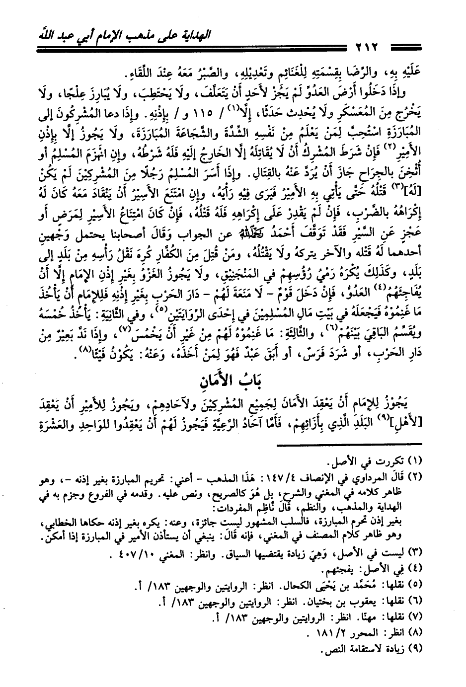 (¬2) قَالَ المرداوي في الإنصاف 4/ 147: هَذَا المذهب - أعني: تحريم المبارزة بغير إذنه -، وهو ظاهر كلامه في المغني والشرح، بل هُوَ كالصريح، ونص عليه. وقدمه في الفروع وجزم به في الهداية والمذهب، والنظم، قَالَ نَّاظِم المفردات:
