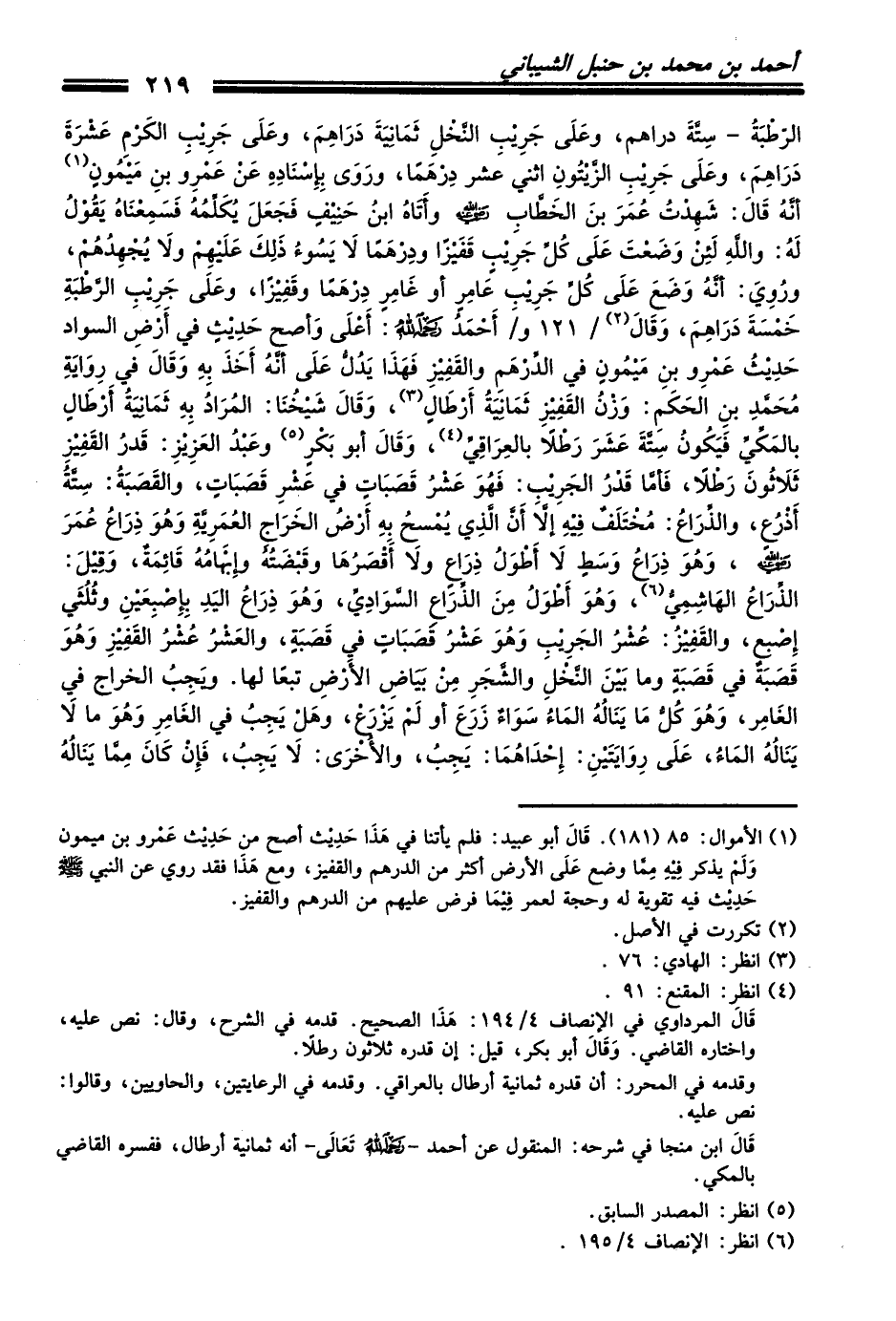 الرّطْبَةُ - سِتَّةَ دراهم، وعَلَى جَرِيْبِ النَّخْلِ ثَمَانِيَةَ دَرَاهِمَ، وعَلَى جَرِيْبِ الكَرْمِ عَشْرَةَ دَرَاهِمَ، وعَلَى جَرِيْبِ الزَّيْتُونِ اثني عشر دِرْهَماً، ورَوَى بِإِسْنَادِهِ عَنْ عَمْرِو بنِ مَيْمُونٍ (¬1) أنَّهُ قَالَ: شَهِدْتُ عُمَرَ بنَ الخَطَّابِ - رضي الله عنه - وأَتَاهُ ابنُ حَنِيْفٍ فَجَعَلَ يُكَلِّمُهُ فَسَمِعْنَاهُ يَقُوْلُ لَهُ: واللهِ لَئِنْ وَضَعْتَ عَلَى كُلِّ جَرِيْبٍ قَفَيْزاً ودِرْهَماً لاَ يَسُوءُ ذَلِكَ عَلَيْهِمْ ولاَ يُجْهِدُهُمْ، ورُوِيَ: أنَّهُ وَضَعَ عَلَى كُلِّ جَرِيْبِ عَامِرٍ أو غَامِرٍ دِرْهَماً وقَفِيْزاً، وعَلَى جَرِيْبِ الرَّطْبَةِ خَمْسَةَ دَرَاهِمَ، وَقَالَ (¬2) / 121 و / أَحْمَدُ - رضي الله عنه -: أَعْلَى وَأصح حَدِيْثٍ في أَرْضِ السواد حَدِيْثُ عَمْرِو بنِ مَيْمُونٍ في الدِّرْهَمِ والقَفِيْزِ فَهَذَا يَدُلُّ عَلَى أنَّهُ أَخَذَ بِهِ وَقَالَ في رِوَايَةِ مُحَمَّدِ بنِ الحَكَمِ: وَزْنُ القَفِيْزِ ثَمَانِيَةُ أَرْطَالٍ (¬3)، وَقَالَ شَيْخُنَا: المُرَادُ بِهِ ثَمَانِيَةُ أَرْطَالٍ بالمَكِّيِّ فَيَكُونُ سِتَّةَ عَشَرَ رَطْلاً بالعِرَاقِيِّ (¬4)، وَقَالَ أبو بَكْرٍ (¬5) وعَبْدُ العَزِيْزِ: قَدَرُ القَفِيْزِ ثَلاَثُونَ رَطْلاً، فَأمَّا قَدْرُ الجَرِيْبِ: فَهُوَ عَشْرُ قَصَبَاتٍ في عَشْرِ قَصَبَاتٍ، والقَصَبَةُ: سِتَّةُ أَذْرُعٍ، والذِّرَاعُ: مُخْتَلَفٌ فِيْهِ إلاَّ أَنَّ الَّذِي يُمْسحُ بِهِ أَرْضُ الخَرَاجِ العُمَرِيَّةِ وَهُوَ ذِرَاعُ عُمَرَ - رضي الله عنه -، وَهُوَ ذِرَاعُ وَسَطٍ لاَ أَطْوَلُ ذِرَاعٍ ولاَ أَقْصَرُهَا وقَبْضَتُهُ وإِبْهَامُهُ قَائِمَةٌ، وَقِيْلَ: الذِّرَاعُ الهَاشِمِيُّ (¬6)، وَهُوَ أَطْوَلُ مِنَ الذِّرَاعِ السَّوَادِيِّ، وَهُوَ ذِرَاعُ اليَدِ بِإِصْبِعَيْنِ وثُلُثَي إِصْبِعٍ، والقَفِيْزُ: عُشْرُ الجَرِيْبِ وَهُوَ عَشْرُ قَصَبَاتٍ في قَصَبَةٍ، والعَشْرُ عُشْرُ القَفِيْزِ وَهُوَ قَصَبَةٌ في قَصَبَةٍ وما بَيْنَ النَّخْلِ والشَّجَرِ مِنْ بَيَاضِ الأَرْضِ تبعاً لها. ويَجِبُ الخراج في الغَامِر، وَهُوَ كُلُّ مَا يَنَالُهُ المَاءُ سَوَاءٌ زَرَعَ أو لَمْ يَزْرَعْ، وهَلْ يَجِبُ في الغَامِرِ وَهُوَ ما لاَ يَنَالُهُ المَاءُ، عَلَى رِوَايَتَيْنِ: إِحْدَاهُمَا: يَجِبُ، والأُخْرَى: لاَ يَجِبُ، فَإِنْ كَانَ مِمَّا يَنَالُهُ