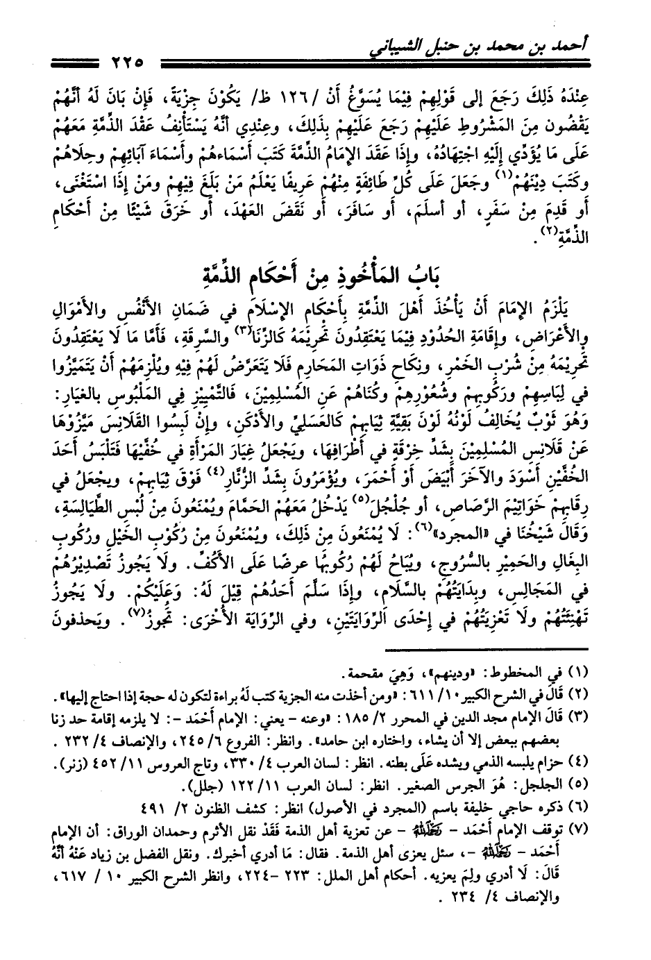 يَلْزَمُ الإِمَامَ أَنْ يَأْخُذَ أَهْلَ الذِّمَّةِ بِأَحْكَامِ الإِسْلاَمِ في ضَمَانِ الأَنْفُسِ والأَمْوَالِ والأَعْرَاضِ، وإِقَامَةِ الحُدُوْدِ فِيْمَا يَعْتَقِدُونَ تَحْرِيْمَهُ كَالزِّنَا (¬3) والسَّرِقَةِ، فَأَمَّا مَا لاَ يَعْتَقِدُونَ تَحْرِيْمَهُ مِنْ شُرْبِ الخَمْرِ، ونِكَاحِ ذَوَاتِ المَحَارِمِ فَلاَ يَتَعَرَّضُ لَهُمْ فِيْهِ ويُلْزِمَهُمْ أَنْ يَتَمَيَّزُوا في لِبَاسِهِمْ ورَكُوبِهِمْ وشُعُوْرِهِمْ وكُنَاهُمْ عَنِ المُسْلِمِيْنَ، فَالتَّمْيِيْزِ فِي المَلْبُوسِ بالغيَارِ: وَهُوَ ثَوْبٌ يُخَالِفُ لَوْنُهُ لَوْنَ بَقِيَّةِ ثِيَابِهِمْ كَالعَسَلِيِّ والأَدْكَنِ، وإِنْ لَبِسُوا القَلاَنِسَ مَيَّزُوْهَا عَنْ قَلاَنِسِ المُسْلِمِيْنَ بِشَدِّ خِرْقَةٍ في أَطْرَافِهَا، ويَجْعَلُ غِيَارَ المَرْأَةِ في خُفَّيْهَا فَتَلْبَسُ أَحَدَ الخُفَّيْنِ أَسْوَدَ والآخَرَ أَبْيَضَ أَوْ أَحْمَرَ، ويُؤْمَرُونَ بِشَدِّ الزُّنَّارِ (¬4) فَوْقَ ثِيَابِهِمْ، ويجْعَلُ في رِقَابِهِمْ خَوَاتِيْمَ الرَّصَاصِ، أو جُلْجُلَ (¬5) يَدْخُلُ مَعَهُمْ الحَمَّامَ ويُمْنَعُونَ مِنْ لُبْسِ الطَّيَالِسَةِ، وَقَالَ شَيْخُنَا في " المجرد " (¬6): لاَ يُمْنَعُونَ مِنْ ذَلِكَ، ويُمْنَعُونَ مِنْ رُكُوْبِ الخَيْلِ ورُكُوبِ البِغَالِ والحَمِيْرِ بالسُّرُوجِ، ويُبَاحُ لَهُمْ رُكُوبُهَا عرضاً عَلَى الأَكُفِّ. ولاَ يَجُوزُ تَصْدِيْرُهُمْ في المَجَالِسِ، وبِدَايَتُهُمْ بالسَّلاَمِ، وإِذَا سَلَّمَ أَحَدُهُمْ قِيْلَ لَهُ: وَعَلَيْكُمْ. ولاَ يَجُوزُ تَهْنِئَتُهُمْ ولاَ تَعْزِيَتُهُمْ في إِحْدَى الرِّوَايَتَيْنِ، وفي الرِّوَايَة الأُخْرَى: تَجُوزُ (¬7). ويَحذفونَ
