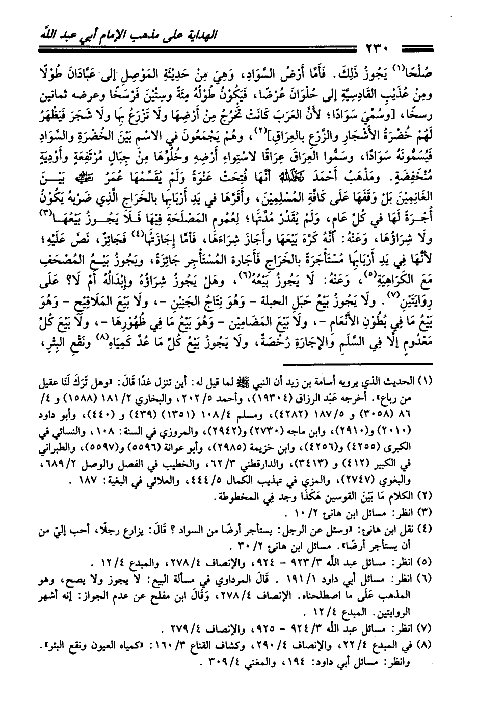 صُلْحاً (¬1) يَجُوزُ ذَلِكَ. فَأَمَّا أَرْضُ السَّوَادِ، وَهِيَ مِنْ حَدِيْثَةِ المَوْصِلِ إلى عَبَّادَانَ طُوْلاً ومِنْ عُذَيْبِ القَادِسِيَّةِ إلى حُلْوَانَ عُرْضاً، فَيَكُوْنُ طُوْلُهُ مِئَةً وسِتِّيْنَ فَرْسَخاً وعرضه ثمانين رسخاً، [وسُمِّيَ سَوَاداً؛ لأَنَّ العَرَبَ كَانَتْ تَخْرُجُ مِنْ أَرْضِهَا ولاَ تَزْرَعُ بِهَا ولاَ شَجَرَ فَيَظْهَرُ لَهُمْ خُضْرَةُ الأَشْجَارِ والزَّرْعِ بالعِرَاقِ] (¬2)، وهُمْ يَجْمَعُونَ في الاسْمِ بَيْنَ الخُضْرَةِ والسَّوَادِ فَيُسَمُّونَهُ سَوَاداً، وسَمُّوا العِرَاقَ عِرَاقاً لاسْتِواءِ أَرْضِهِ وخُلُوِّهَا مِنْ جِبَالٍ مُرْتَفِعَةٍ وأَوْدِيَةٍ مُنْخَفِضَةٍ. ومَذْهَبُ أَحْمَدَ - رَحِمَهُ اللهُ - أنَّهَا فُتِحَتْ عَنْوَةً وَلَمْ يُقَسِّمْهَا عُمَرُ - رضي الله عنه - بَيْنَ الغَانِمِيْنَ بَلْ وَقَفَهَا عَلَى كَافَّةِ المُسْلِمِيْنَ، وأَقَرَّهَا في يَدِ أَرْبَابِهَا بالخَرَاجِ الَّذِي ضَرْبهُ يَكُوْنُ أُجْرَةً لَهَا في كُلِّ عَامٍ، وَلَمْ يُقَدِّرْ مُدَّتَهَا؛ لِعُمُومِ المَصْلَحَةِ فِيْهَا فَلاَ يَجُوزُ بَيْعُهَا (¬3) ولاَ شِرَاؤُهَا، وَعَنْهُ: أنَّهُ كَرَّهَ بَيْعَهَا وأَجَازَ شِرَاءَهَا، فَأمَّا إِجَازَتُهَا (¬4) فَجَائِزٌ، نَصَّ عَلَيْهِ؛ لأنَّهَا فِي يَدِ أَرْبَابِهَا مُسْتَأْجَرَةً بالخَرَاجِ فَأَجَارة المُسْتَأْجِر جَائِزَةً، ويَجُوزُ بَيْعُ المُصْحَفِ مَعَ الكَرَاهِيَةِ (¬5)، وَعَنْهُ: لاَ يَجُوزُ بَيْعُهُ (¬6)، وهَلْ يَجُوزُ شِرَاؤُهُ وإِبْدَالُهُ أَمْ لاَ؟ عَلَى رِوَايَتَيْنِ (¬7). ولاَ يَجُوزُ بَيْعُ حَبَلِ الحبلة - وَهُوَ نِتَاجُ الجَنِيْنِ -، ولاَ بَيْعَ المَلاَقِيْحِ - وَهُوَ بَيْعُ مَا فِي بُطُوْنِ الأَنْعَامِ -، ولاَ بَيْعَ المَضَامِيْن - وَهُوَ بَيْعُ مَا فِي ظُهُوْرِهَا -، ولاَ بَيْعَ كُلِّ مَعْدُومٍ إلاَّ فِي السَّلَمِ والإِجَارَةِ رُخْصَةٌ، ولاَ يَجُوزُ بَيْعُ كُلِّ مَا عُدَّ كَمِيَاهِ (¬8) ونَقْعِ البِئْرِ،