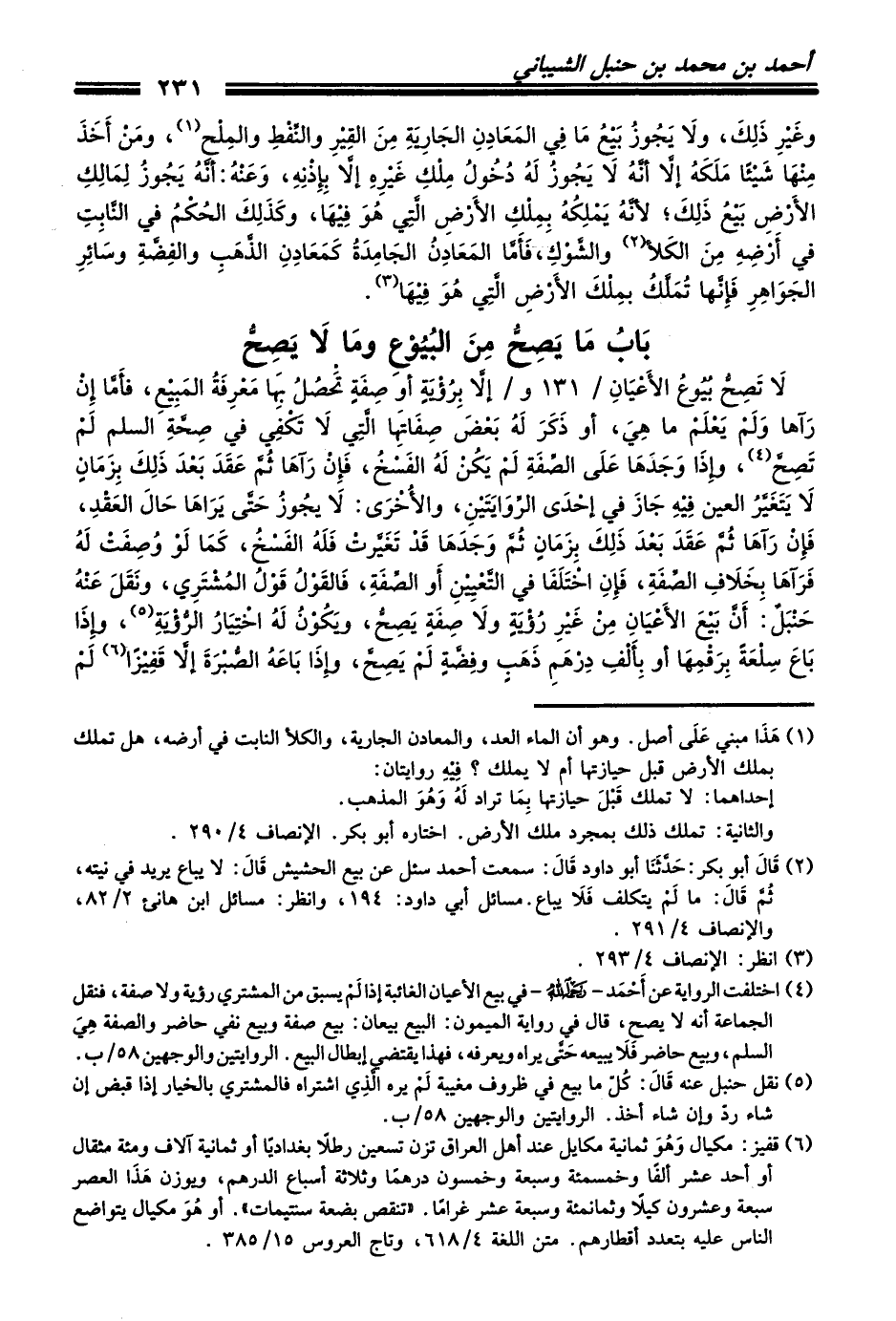 لاَ تَصِحُّ بُيُوعُ الأَعْيَانِ / 131 و / إلاَّ بِرُؤْيَةٍ أو صِفَةٍ تَحْصُلُ بِهَا مَعْرِفَةُ المَبِيْعِ، فأَمَّا إِنْ رَآها وَلَمْ يَعْلَمْ ما هِيَ، أو ذَكَرَ لَهُ بَعْضَ صِفَاتِهَا الَّتِي لاَ تَكْفِي في صِحَّةِ السلم لَمْ تَصِحَّ (¬4)، وإِذَا وَجَدَهَا عَلَى الصِّفَةِ لَمْ يَكُنْ لَهُ الفَسْخُ، فَإِنْ رَآهَا ثُمَّ عَقَدَ بَعْدَ ذَلِكَ بِزَمَانٍ لاَ يَتَغَيَّرُ العين فِيْهِ جَازَ في إحْدَى الرِّوَايَتَيْنِ، والأُخْرَى: لاَ يجُوزُ حَتَّى يَرَاهَا حَالَ العَقْدِ، فَإِنْ رَآهَا ثُمَّ عَقَدَ بَعْدَ ذَلِكَ بِزَمَانٍ ثُمَّ وَجَدَهَا قَدْ تَغَيَّرتْ فَلَهُ الفَسْخُ، كَمَا لَوْ وُصِفَتْ لَهُ فَرَآهَا بِخَلاَفِ الصِّفَةِ، فَإِنِ اخْتَلَفَا في التَّعْيِيْنِ أَو الصِّفَةِ، فَالقَوْلُ قَوْلُ المُشْتَرِي، ونَقَلَ عَنْهُ حَنْبَلٌ: أَنَّ بَيْعَ الأَعْيَانِ مِنْ غَيْرِ رُؤْيَةٍ ولاَ صِفَةٍ يَصِحُّ، ويَكُوْنُ لَهُ اخْتِيَارُ الرُّؤْيَةِ (¬5)، وإِذَا بَاعَ سِلْعَةً بِرَقْمِهَا أو بِأَلْفِ دِرْهَمِ ذَهَبٍ وفِضَّةٍ لَمْ يَصِحَّ، وإِذَا بَاعَهُ الصُّبْرَةَ إلاَّ قَفِيْزاً (¬6) لَمْ