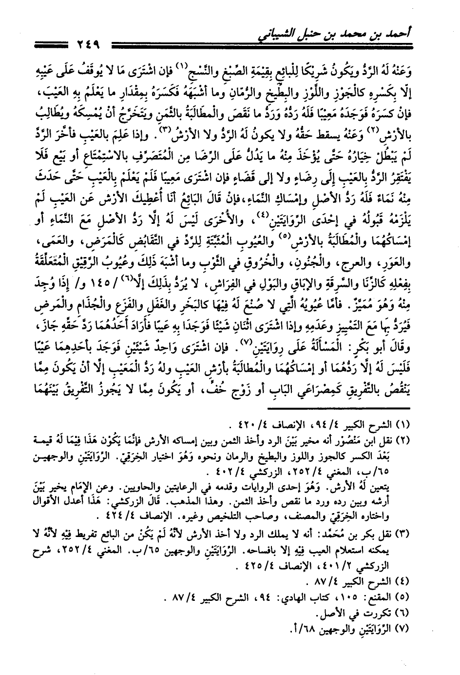 وَعَنْهُ لَهُ الرَّدُّ ويَكُونُ شَرِيْكاً لِلْبائِعِ بِقِيْمَةِ الصِّبْغِ والنَّسْجِ (¬1) فإن اشْتَرَى مَا لا يُوقَفُ عَلَى عَيْبِهِ إلاّ بِكَسْرِهِ كالْجَوْزِ واللَّوْزِ والبِطِّيخِ والرُّمّانِ وما أشْبَهَهُ فَكَسَرَهُ بِمِقْدَارِ ما يَعْلَمُ بِهِ العَيْبَ، فإنْ كسَرَهُ فَوَجَدَهُ مَعِيْباً فَلَهُ رَدُّهُ وَرَدُّ ما نَقَصَ والْمطَالَبَةُ بالثَّمَنِ ويَتَخَرَّجُ أنْ يُمْسِكَهُ ويُطَالِبُ بالأرْشِ (¬2) وَعَنْهُ يسقط حَقُّهُ ولا يكونُ لَهُ الرَّدُّ ولا الأرْشُ (¬3). وإذا عَلِمَ بالعَيْبِ فأخَّرَ الرَّدَّ لَمْ يَبْطُلْ خِيَارُهُ حَتَّى يُؤْخَذَ مِنْهُ ما يَدُلُّ عَلَى الرِّضَا مِن الْمُتَصَرِّفِ بالاسْتِمْتَاعِ أو بَيْع فَلاَ يَفْتَقِرُ الرَّدُّ بِالعَيْبِ إِلَى رِضَاءٍ ولا إلى قَضَاءٍ فإن اشْتَرَى مَعِيباً فَلَمْ يَعْلَمْ بِالْعَيْبِ حَتَّى حَدَثَ مِنْهُ نَمَاءٌ فَلَهُ رَدُّ الأصْلِ وإمْسَاكِ النَّمَاءِ، فإنْ قَالَ البَائِعُ أنَا أُعْطِيكَ الأرْشُ عَن العَيْبِ لَمْ يَلْزَمْهُ قَبُولُهُ في إحْدَى الرِّوَايَتَيْنِ (¬4)، والأُخْرَى لَيْسَ لَهُ إلاَّ رَدُّ الأصْلِ مَعَ النَّمَاءِ أو إمْسَاكُهُمَا والْمُطَالَبَةُ بالأرْشِ (¬5) والعُيُوبِ الْمُثَبَّتَةِ لِلرَّدِّ في التَّقَابُضِ كَالْمَرَضِ، والعَمَى، والعَوَرِ، والعرج، والْجُنُونِ، والْخُرُوقِ في الثَّوْبِ وما أشْبَهَ ذَلِكَ وعُيُوبُ الرَّقِيْقِ الْمُتَعَلِّقَةُ بِفِعْلِهِ كَالزِّنَا والسَّرِقَةِ والإبَاقِ والبَوْلِ في الفِرَاشِ، لا يُرَدُّ بِذَلِكَ إلاَّ (¬6) /145 و/ إِذَا وُجِدَ مِنْهُ وَهُوَ مُمَيَّزٌ. فأمَّا عُيُويُهُ الَّتِي لا صُنْعَ لَهُ فِيْهَا كالبَخَرِ والغَفَلِ والفَزَعِ والْجُذَامِ والْمَرضِ فَيُرَدُّ بِهَا مَعَ التَمْيِيزِ وعَدَمِهِ وإذا اشْتَرَى اثْنَانِ شَيْئاً فَوَجَدَا بِهِ عَيباً فأَرَادَ أَحَدُهُمَا رَدَّ حَقِّهِ جَازَ، وقَالَ أبو بَكْرٍ: الْمَسْأَلَةُ عَلَى رِوَايَتَيْنِ (¬7). فإن اشْتَرَى وَاحِدٌ شَيْئَيْنِ فَوَجَدَ بأحَدِهِمَا عَيْباً فَلَيْسَ لَهُ إلاَّ رَدُّهُمَا أو إمْسَاكُهُمَا والْمُطالَبَةُ بأرْشِ العَيْبِ ولهُ رَدُّ الْمَعَيْبِ إلاَّ أنْ يَكُونَ مِمَّا يَنْقُصُ بالتَّفْرِيقِ كَمِصْرَاعَي البَابِ أو زَوْج خُفٍّ، أو يَكُونَ مِمَّا لا يَجُوزُ التَّفْرِيقُ بَيْنَهُمَا