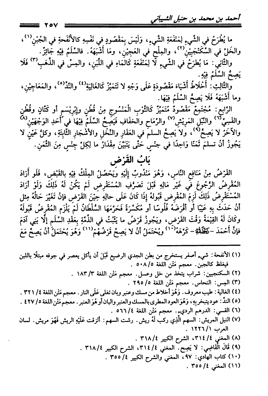 القَرْضُ مِنْ مَنَافِعِ النَّاسِ، وَهُوَ مَنْدُوبٌ إِلَيْهِ ويَحْصُلُ المِلْكُ فِيْهِ بالقَبْضِ، فَلَو أَرَادَ المُقْرِضُ الرُّجُوعَ في غَيْر مَالِهِ قَبْلَ تَصَرُّفِ المُسْتَقْرِضِ لَمْ يَكُنْ لَهُ ذَلِكَ وَلَوْ أرَادَ المُسْتَقْرِضُ ذَلِكَ لَزِمَ المُقْرِضُ قَبُولَهُ إِذَا كَانَ عَلَى حالِهِ حِيْنَ القَرْضِ فإنْ تَغَيَّرَ حَالُهُ مِثل أنْ حَدَثَ بِهِ عَيْباً أو أقْرَضَهُ فُلُوساً أو مُكَسَّرَةً فَحَرَّمَهَا السُّلْطَانُ لَمْ يَلْزَم المُقْرِضُ قَبُولَهُ وكَانَ لَهُ القِيْمَةُ وَقْتَ القَرْضِ، ويَجُوزُ قَرْضُ ما يَثْبُتُ في الذِّمَّةِ بِعَقْدِ السَّلَمِ إلاَّ بَنِي آدَمَ فإنَّ أَحْمَدَ