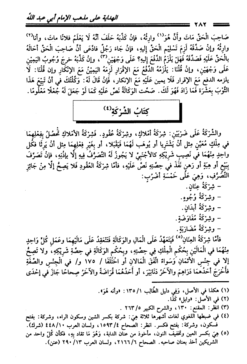 (¬5) هِيَ بكسر العين وتخفيف النون، مأخوذ من عنان الدابة، وَهُوَ مَا تقاد بِهِ، فكأن كُلّ واحد من الشريكين أخذ بعنان صاحبه. الصحاح 6/ 2166، ولسان العرب 13/ 290 (عنن).