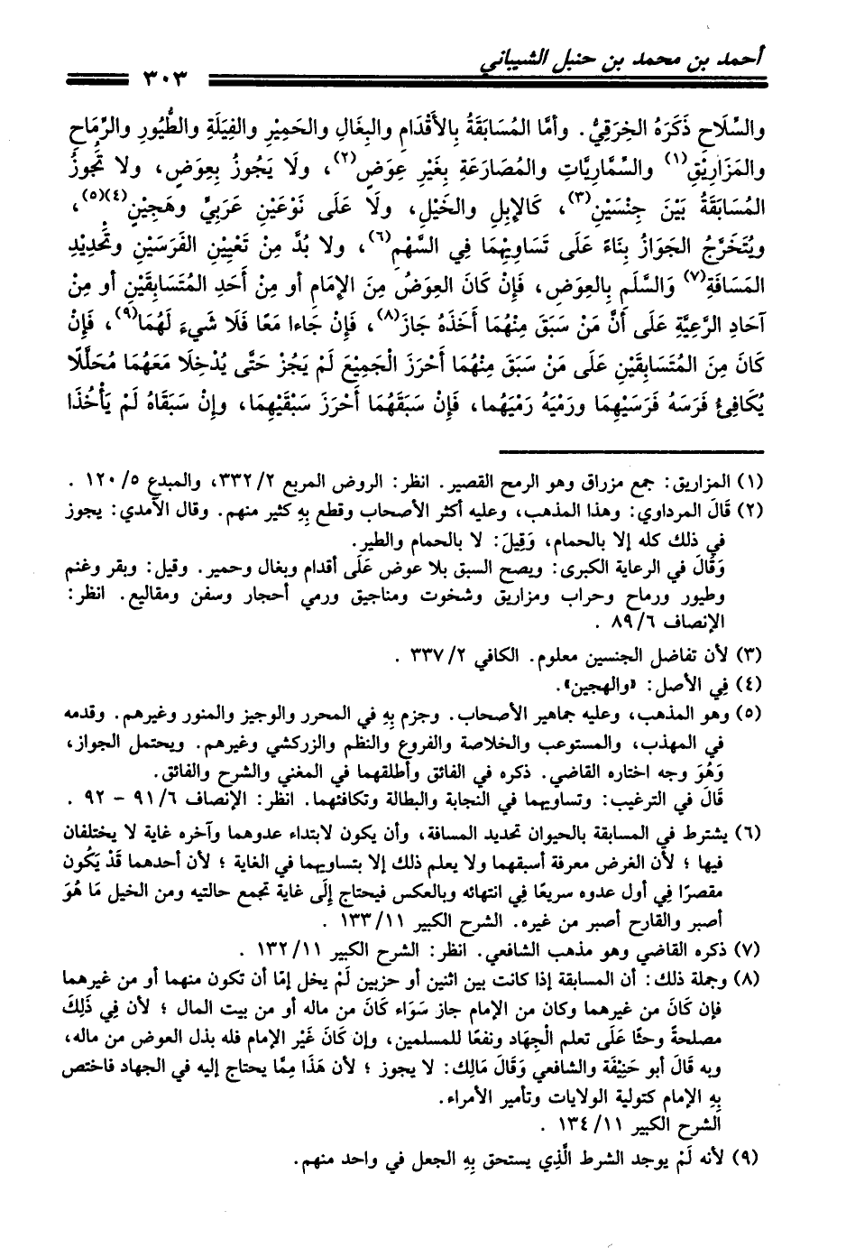 والسِّلاَحِ ذَكَرَهُ الخِرَقِيُّ. وأمَّا المُسَابَقَةُ بِالأَقْدَامِ والبِغَالِ والحَمِيْرِ والفِيَلَةِ والطُّيُورِ والرِّمَاحِ والمَزَارِيْقِ (¬1) والسِّمَّارِيَّاتِ والمُصَارَعَةِ بِغَيْرِ عِوَضٍ (¬2)، ولاَ يَجُوزُ بِعِوَضٍ، ولا تَجُوزُ المُسَابَقَةُ بَيْنَ جِنْسَيْنِ (¬3)، كَالإِبِلِ والخَيْلِ، ولاَ عَلَى نَوْعَيْنِ عَرَبِيٍّ وهَجِيْنٍ (¬4) (¬5)، ويُتَخَرَّجُ الجَوَازُ بِنَاءً عَلَى تَسَاوِيْهِمَا فِي السَّهْمِ (¬6)، ولا بُدَّ مِنْ تَعْيِيْنِ الفَرَسَيْنِ وتَحْدِيْدِ المَسَافَةِ (¬7) وَالسَّلَمِ بِالعِوَضِ، فَإِنْ كَانَ العِوَضُ مِنَ الإِمَامِ أو مِنْ أَحَدِ المُتَسَابِقَيْنِ أو مِنْ آحَادِ الرَّعِيَّةِ عَلَى أنَّ مَنْ سَبَقَ مِنْهُمَا أَخَذَهُ جَازَ (¬8)، فَإِنْ جَاءا مَعاً فَلاَ شَيءَ لَهُمَا (¬9)، فَإِنْ كَانَ مِنَ المُتَسَابِقَيْنِ عَلَى مَنْ سَبَقَ مِنْهُمَا أَحْرَزَ الْجَمِيْعَ لَمْ يَجُزْ حَتَّى يُدْخِلاَ مَعَهُمَا مُحَلَّلاً يُكَافِئُ فَرَسَهُ فَرَسَيْهِمَا ورَمْيَهُ رَمْيَهُما، فَإِنْ سَبَقَهُمَا أَحْرَزَ سَبْقَيْهِمَا، وإِنْ سَبَقَاهُ لَمْ يَأْخُذَا