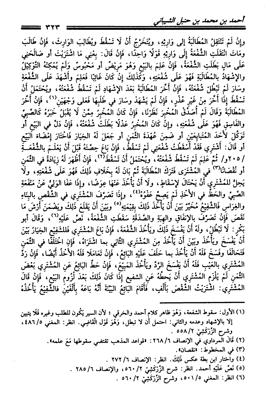 لَمْ تَنْتَقِلُ المُطَالَبَةُ إلى وَارِثِهِ، ويُتَخَرَّجُ أَنْ لاَ تَسْقُطَ ويُطَالِبَ الوَارِثَ، فَإِنْ طَالَبَ ومَاتَ انْتَقَلَتِ الشُّفْعَةُ إِلَى وَارِثِهِ قَوْلاً وَاحِداً، فَإِنْ قَالَ: بِعْنِي مَا اشْتَرَيْتَ أو صَالَحَنِي عَلَى مَالٍ بَطَلَتِ الشُّفْعَةُ، فَإِنْ عَلِمَ بالبَيْعِ وَهُوَ مَرِيْضٌ أو مَحْبُوسٌ وَلَمْ يُمْكِنْهُ التَّوْكِيْلُ والإِشْهَادُ بالمُطَالَبَةِ فَهُوَ عَلَى شُفْعَتِهِ، وَكَذَلِكَ إِنْ كَانَ غَائِباً فَعَلِمَ وأَشْهَدَ عَلَى الشُّفْعَةِ وسَارَ لَمْ تَبْطُلْ شُفْعَتُهُ، فَإِنْ أَخَّرَ المُطَالَبَةَ بَعْدَ الإِشْهَادِ لَمْ تَسْقُطْ شُفْعَتُهُ، ويُحْتَمَلُ أَنْ تَسْقُطَ إِذَا أَخَّرَ مِنْ غَيْرِ عُذْرٍ، فَإِنْ لَمْ يَشْهَدْ وسَارَ في طَلَبِهَا فَعَلى وَجْهَيْنِ (¬1)، فَإِنْ أَخَّرَ المُطَالَبَةَ وَقَالَ لَمْ أُصَدِّقْ المُخْبِرَ نَظَرْنَا، فَإِنْ كَانَ المُخْبِرُ مِمَّنْ لاَ يُقْبَلُ خَبَرُهُ كَالصَّبِيِّ والفَاسِقِ فَهُوَ عَلَى شُفْعَتِهِ، وإِنْ كَانَ المُخْبِرُ عَدْلاً بَطَلَتْ شُفْعَتُهُ، فَإِنْ دَلَّ في البَيْعِ أو تَوَكَّلَ لأَحَدَ المُتَبايِعَيْنِ أو ضَمِنَ عُهْدَةَ الثَّمَنِ أو جَعَلَ لَهُ الخِيَارَ فَاخْتَارَ إِمْضَاءَ البَيْعِ أو قَالَ: أَشْتَرِي فَقَدْ أَسْقَطْتُ شُفْعَتِي لَمْ تَسْقُطْ، فَإِنْ بَاعَ حِصَّتَهُ قَبْلَ أَنْ يَعْلَمَ بالشُّفْعَةِ /205 و/ ثُمَّ عَلِمَ لَمْ تَسْقُطْ شُفْعَتُهُ، ويُحْتَمَلُ أَنْ تَسْقُطَ (¬2)، فَإِنْ أَظْهَرَ لَهُ زِيَادَةً في الثَّمَنِ أو نُقْصَاناً (¬3) في المُشْتَرَى فَتَرَكَ المُطَالَبَةَ ثُمَّ بَانَ لَهُ بِخَلاَفِ ذَلِكَ فَهُوَ عَلَى شُفْعَتِهِ، ولاَ يَحِلُّ للمُشْتَرِي أَنْ يَحْتَالَ لإِسْقَاطٍ، ولاَ أَنْ يَأْخُذَ عَنْهَا عِوَضاً، وإِذَا عَفَا الوَلِيُّ عَنْ مَنْفَعَةِ الصَّبِيِّ والحَظِّ في الأَخْذِ لَمْ يَصِحَّ عَفْوُهُ (¬4)، وإِذَا تَصَرَّفَ المُشْتَرِي في الشِّقْصِ بالبِنَاءِ والغِرَاسِ فَالشَّفِيْعُ مُخَيَّرٌ بَيْنَ أَنْ يَأْخُذَ ذَلِكَ بِقِيْمَتِهِ (¬5) وبَيْنَ أَنْ يَقَلَعَ ذَلِكَ ويَضْمَنَ أَرْشَ مَا نَقَصَ فَإِنْ تَصَرَّفَ بالإنفَاقِ والهِبَةِ والصَّدَقَةِ سَقَطَتِ الشُّفْعَةُ، نَصَّ عَلَيْهِ (¬6)، وَقَالَ أبو بَكْرٍ: لاَ تَبْطُلُ، ولَهُ أَنْ يَفْسَخَ ذَلِكَ ويَأْخُذَ الشُّفْعَةَ، فَإِنْ بَاعَ المُشْتَرِي فَللشَفِيْعِ الخِيَارُ بَيْنَ أَنْ يَفْسَخَ ويَأْخُذَ وبَيْنَ أَنْ يَأْخُذَ مِنَ المُشْتَرِي الثَّانِي بما اشْتَرَاهُ، فَإِنِ اخْتَلَفَا في الثَّمَنِ فَتَحَالَفَا وفَسَخَ فَلَهُ أَنْ يَأْخُذَ بما حَلَفَ عَلَيْهِ البَائِعُ، فَإِنْ تَعَامَلاَ فَلَهُ الأَخْذُ أَيْضاً، فَإِنْ رَدَّ المُشْتَرِي بالعَيْبِ فَلَهُ أَنْ يَفْسَخَ الرَّدَّ ويَأْخُذَ المَبِيْعَ، فَإِنْ حَطَّ البَائِعُ عَنِ المُشْتَرِي بَعْضَ الثَّمَنِ لَمْ يَلْزَمِ المُشْتَرِي أَنْ يَحطَّهُ عَنِ الشفيع إِذَا كَانَ ذَلِكَ بَعْدَ لُزُومِ البَيْعِ، فَإِنْ قَالَ المُشْتَرِي: اشْتَرَيْتُ الشِّقْصَ بَأَلْفٍ، فَأَقَامَ البَائِعُ البَيِّنَةَ أَنَّهُ بَاعَهُ بِأَلْفَيْنِ فالشَّفِيْعُ يَأْخُذُهُ
