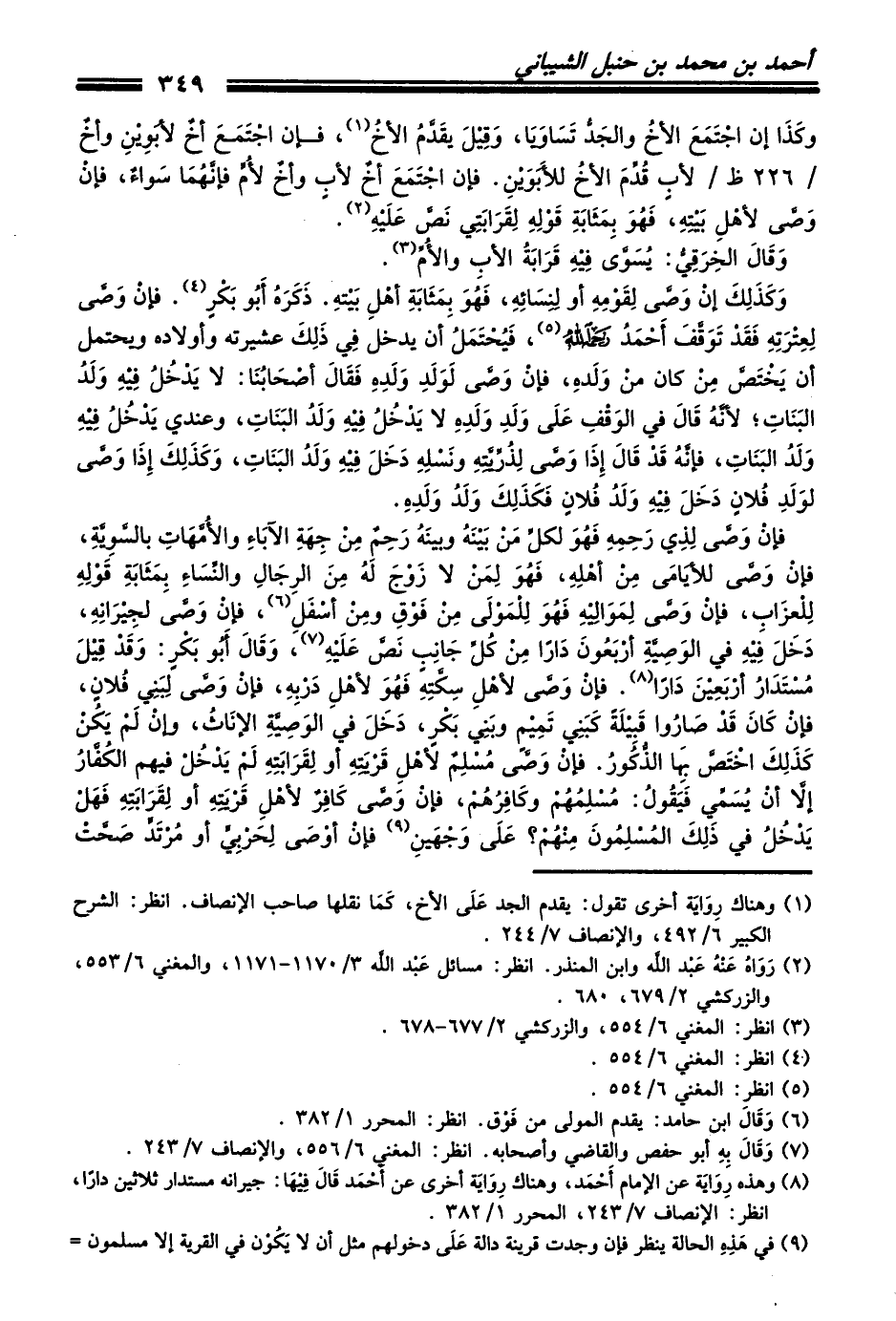 فإنْ وَصَّى لِذِي رَحِمِهِ فَهُوَ لكلِّ مَنْ بَيْنَهُ وبينَهُ رَحِمٌ مِنْ جِهَةِ الآبَاءِ والأُمَّهَاتِ بالسَّوِيَّةِ، فإنْ وَصَّى للأيَامَى مِنْ أهْلِهِ، فَهُوَ لِمَنْ لا زَوْجَ لَهُ مِنَ الرِجَالِ والنِّسَاءِ بِمَثَابَةِ قَوْلِهِ لِلْعزَابِ، فإنْ وَصَّى لِمَوَالِيْهِ فَهُوَ لِلْمَوْلَى مِنْ فَوْقِ ومِنْ أسْفَلِ (¬6)، فإنْ وَصَّى لجِيْرَانِهِ، دَخَلَ فِيْهِ في الوَصِيَّةِ أرْبَعُونَ دَاراً مِنْ كُلِّ جَانِبٍ نَصَّ عَلَيْهِ (¬7)، وَقَالَ أَبُو بَكْرٍ: وَقَدْ قِيْلَ مُسْتَدَارُ أرْبَعِيْنَ دَاراً (¬8). فإنْ وَصَّى لأهْلِ سِكَّتِهِ فَهُوَ لأهْلِ دَرْبِهِ، فإنْ وَصَّى لِبَنِي فُلانٍ، فإنْ كَانَ قَدْ صَارُوا قَبِيْلَةً كَبَنِي تَمِيْمٍ وبَنِي بَكْرٍ، دَخَلَ في الوَصِيَّةِ الإنَاثُ، وإنْ لَمْ يَكُنْ كَذَلِكَ اخْتَصَّ بِهَا الذُّكُورُ. فإنْ وَصَّى مُسْلِمٌ لأهْلِ قَرْيَتِهِ أو لِقَرَابَتِهِ لَمْ يَدْخُلْ فيهم الكُفَّارُ إلاَّ أنْ يُسَمِّي فَيَقُولُ: مُسْلِمُهُمْ وكَافِرُهُمْ، فإنْ وَصَّى كَافِرٌ لأهْلِ قَرْيَتِهِ أو لِقَرَابَتِهِ فَهَلْ يَدْخُلُ في ذَلِكَ المُسْلِمُونَ مِنْهُمْ؟ عَلَى وَجْهَينِ (¬9) فإنْ أوْصَى لِحَرْبِيٍّ أو مُرْتَدٍّ صَحَّتْ
