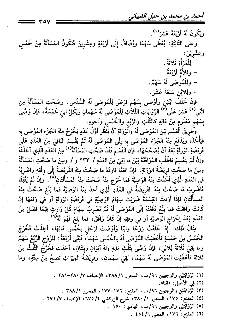 وطرِيقُ القِسْمَ بَيْنَ المُوْصَى لَهُ والوَرَثَةِ أنْ يَنْظُرَ أوَّلَ عَدَدٍ يَخْرُجُ مِنْهُ الجُزْء المُوْصَى بِهِ فيَأْخُذَه ويَدْفَعَ مِنْهُ الجُزْءَ المُوْصَى بِهِ إِلَى المُوْصَى لَهُ ثُمَّ يُقْسِمَ البَاقِيَ مِنَ العَدَدِ عَلَى فَرِيْضَةِ الوَرَثَةِ بَعْدَ أنْ يُصَحِّحَهَا، فإنِ انْقَسَمَ فَقَدْ صَحَّتِ المَسْألَةُ (¬4) مِنَ العَدَدِ الَّذِي أخَذْتَهُ وإنْ لَمْ ينقْسِمْ فاطْلُبِ المُوَافَقَةَ بَيْنَ ما بَقِيَ مِنَ العَدَدِ / 233 و / وبينَ ما صَحَّتِ المَسْألَةُ وبينَ ما صَحَّتِ فَرِيْضَةُ الوَرَثةِ. فإنْ أتفَقَا فاردُدْ ما صَحَّتْ مِنْهُ الفَريْضةُ إِلَى وِفْقِهِ واضْرِبْهُ في العَدَدِ الَّذِي أخَذْتَ مِنْهُ الوَصِيَّةَ فَمَا خَرَجَ مِنْهُ صَحَّتْ مِنْهُ المَسْأَلَتَانِ (¬5). وإنْ لَمْ يَتَّفِقَا فَاضْرِبْ مَا صَحَّتْ مِنْهُ الفَرِيضَةُ في العَدَدِ الَّذِي أخذَ مِنْهُ الوَصِيَّةِ فما بَلَغَ صَحَّتْ مِنْهُ المسأَلَتَانِ فإذَا أرَدَّتَ القِسْمَةَ ضَرَبْتَ سِهَامَ الوَصِيَّةِ في فَرِيْضَةِ الوَرَثَةِ أو في وَفقهَا إنْ كَانَتْ وَافَقَتْ فما بلَغَ دَفَعْتَهُ إِلَى المُوْصَى لَهُ ثُمَّ تَضْرِبُ سِهَامَ كُلِّ وَارِثٍ فِيْمَا فَضَلَ مِنَ العَدَدِ بَعْدَ إخْرَاجِ الوَصِيَّةِ أو في وِفقِهِ إنْ كَانَ وَافَقَ، فما بلغ فَهُوَ لَهُ (¬6).