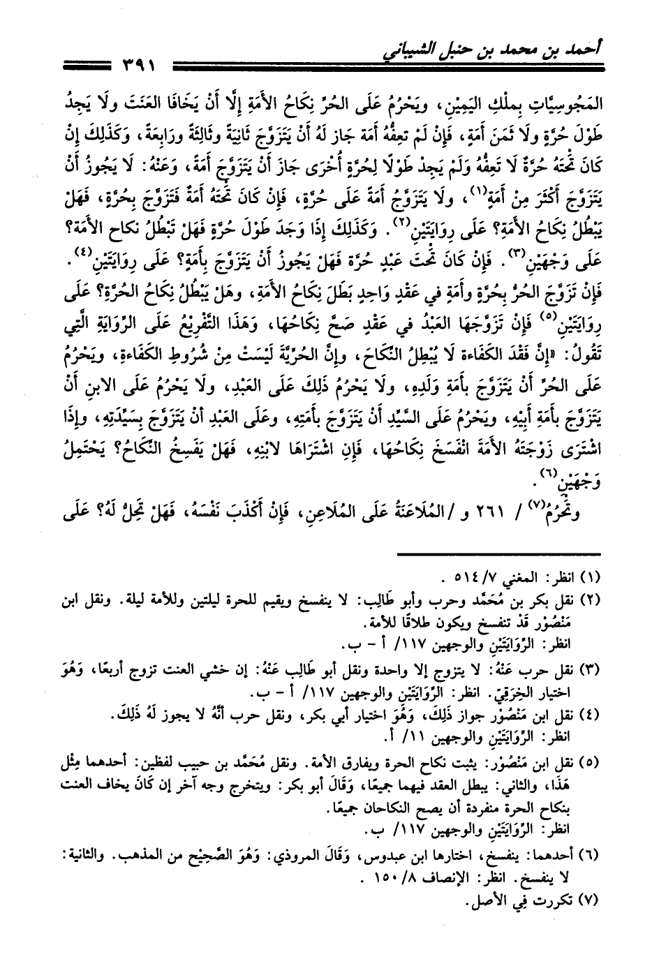 المَجُوسِيَّاتِ بِملْكِ اليَمِيْنِ، ويَحْرُمُ عَلَى الحُرِّ نِكَاحُ الأَمَةِ إِلاَّ أَنْ يَخَافَا العَنَتَ ولاَ يَجِدُ طَوْلَ حُرَّةٍ ولاَ ثَمَنَ أَمَةٍ، فَإِنْ لَمْ تَعِفُّهُ أَمَةُ جَازُ لَهُ أَنْ يَتَزَوَّجَ ثَانِيَةً وثَالِثَةً ورَابِعَةً، وَكَذَلِكَ إِنْ كَانَ تَحْتَهُ حُرَّةٌ لاَ تَعِفُّهُ وَلَمْ يَجِدْ طَوْلاً لِحُرَّةٍ أُخْرَى جَازَ أَنْ يَتَزَوَّجَ أَمَةً، وَعَنْهُ: لاَ يَجُوزُ أَنْ يَتَزَوَّجَ أَكْثَرَ مِنْ أَمَةٍ (¬1)، ولاَ يَتَزَوَّجُ أَمَةً عَلَى حُرَّةٍ، فَإِنْ كَانَ تَحْتَهُ أَمَةٌ فَتَزَوَّجَ بِحُرَّةٍ، فَهَلْ يَبْطُلُ نِكَاحُ الأَمَةِ؟ عَلَى رِوَايَتَيْنِ (¬2). وَكَذَلِكَ إِذَا وَجَدَ طَوْلَ حُرَّةٍ فَهَلْ تَبْطُلُ نكاح الأَمَةُ؟ عَلَى وَجْهَيْنِ (¬3). فَإِنْ كَانَ تَحْتَ عَبْدٍ حُرَّةٌ فَهَلْ يَجُوزُ أَنْ يَتَزَوَّجَ بِأَمَةٍ؟ عَلَى رِوَايَتَيْنِ (¬4). فَإِنْ تَزَوَّجَ الحُرُّ بِحُرَّةٍ وأَمَةٍ في عَقْدٍ وَاحِدٍ بَطَلَ نِكَاحُ الأَمَةِ، وهَلْ يَبْطُلُ نِكَاحُ الحُرَّةِ؟ عَلَى رِوَايَتَيْنِ (¬5) فَإِنْ تَزَوَّجَهَا العَبْدُ في عَقْدٍ صَحَّ نِكَاحُهَا، وَهَذَا التَّفْرِيْعُ عَلَى الرِّوَايَةِ الَّتِي تَقُولُ: ((إِنَّ فَقْدَ الكَفَاءةَ لاَ يُبْطِلُ النِّكَاحَ، وإِنَّ الحُرِّيَّةَ لَيْسَتْ مِنْ شُرُوطِ الكَفَاءةِ، ويَحْرُمُ عَلَى الحُرِّ أَنْ يَتَزَوَّجَ بأَمَةِ وَلَدِهِ، ولاَ يَحْرُمُ ذَلِكَ عَلَى العَبْدِ، ولاَ يَحْرُمُ عَلَى الابنِ أَنْ يَتَزَوَّجَ بأَمَةِ أَبِيْهِ، ويَحْرُمُ عَلَى السَّيِّدِ أَنْ يَتَزَوَّجَ بأَمَتِهِ، وعَلَى العَبْدِ أنْ يَتَزَوَّجَ بِسَيِّدَتِهِ، وإِذَا اشْتَرَى زَوْجَتَهُ الأَمَةَ انْفَسَخَ نِكَاحُهَا، فَإِنِ اشْتَرَاهَا لابْنِهِ، فَهَلْ يَنْفَسِخُ النِّكَاحُ؟ يَحْتَمِلُ وَجْهَيْنِ (¬6).