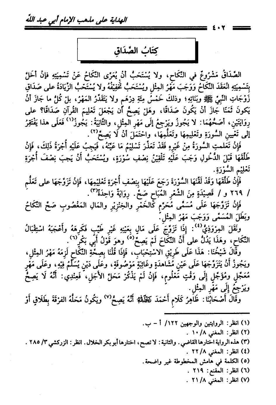 الصَّدَاقُ مَشْرُوعٌ في النِّكَاحِ، ولا يُسْتَحَبُّ أنْ يُعَرَّى النِّكَاحُ عَنْ تَسْمِيَتِهِ فإنْ أخَلَّ بِتَسْمِيَتِهِ انْعَقَدَ النِّكَاحُ وَوَجَبَ مَهْرُ المِثْلِ ويُسْتَحَبُّ تَخْفِيْفُهُ ولا يُسْتَحّبُّ الزِّيَادَةُ على صَدَاقِ زَوْجَاتِ النَّبِيِّ - صلى الله عليه وسلم - وبَنَاتِهِ؛ وذلكَ خَمْسُ مِئَةِ دِرْهَمٍ ولا يَتَقَدَّرُ المَهْرُ، بلْ كُلُّ ما جَازَ أنْ يَكونَ ثَمَناً جَازَ أنْ يَكُونَ صَدَاقاً، وهَلْ يَصِحُّ أن يَجْعَلَ تَعْلِيمَ القُرآنِ صَدَاقاً؟ على رِوَايَتَيْنِ، أصَحُّهُمَا: لا يَجُوزُ ويَرْجِعُ إلَى مَهْرِ المِثْلِ، والثَّانِيَةُ: يَجُوزُ (¬1) فَعَلَى هذا يَفْتَقِرُ إلى تَعْيينِ السُّورَةِ وتَعْلِيمِهَا وتَعَلُّمِهَا، واحْتَمَلَ أنْ لاَ يَصِحَّ (¬2).